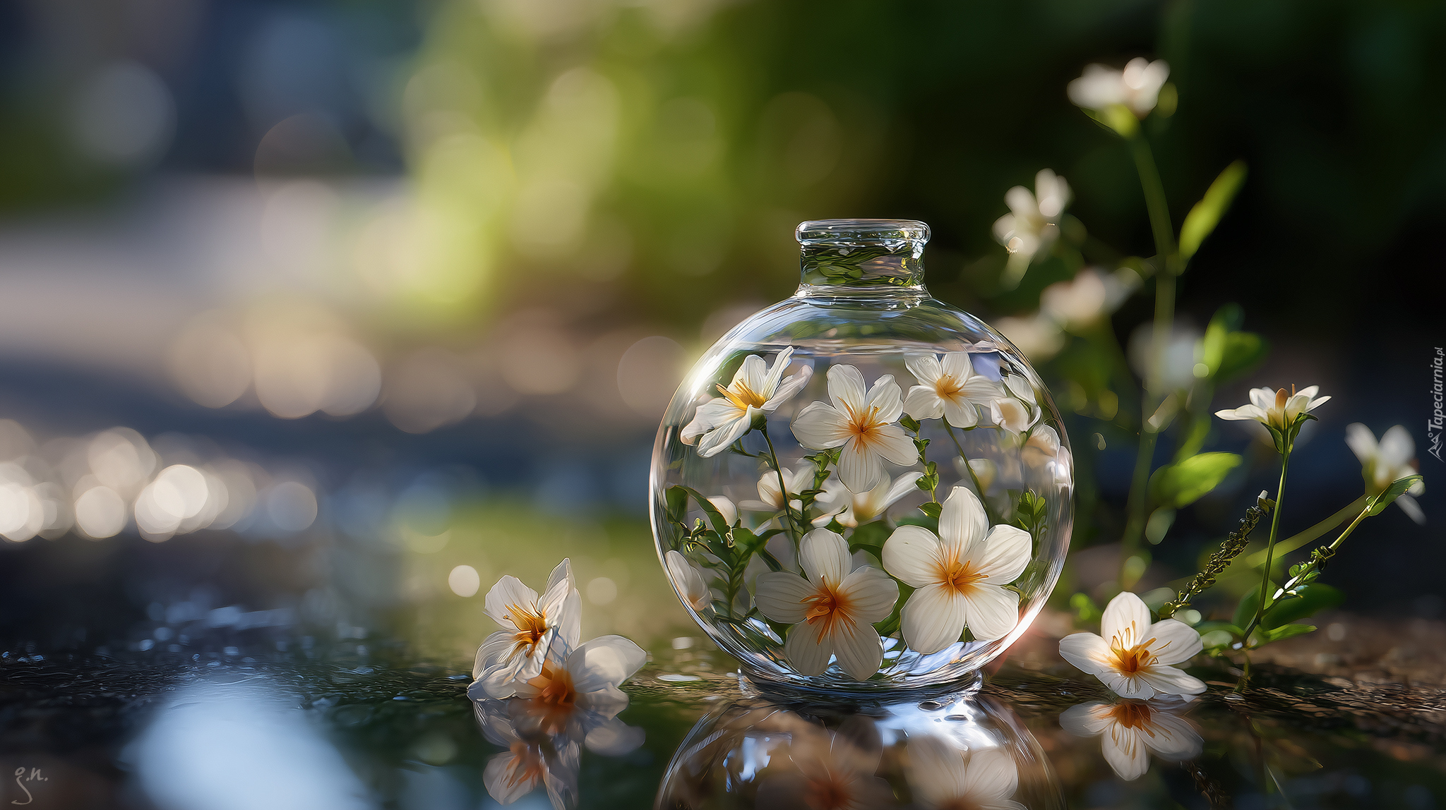 Edytor tapety: Szklany wazonik z kwiatami w wodzie