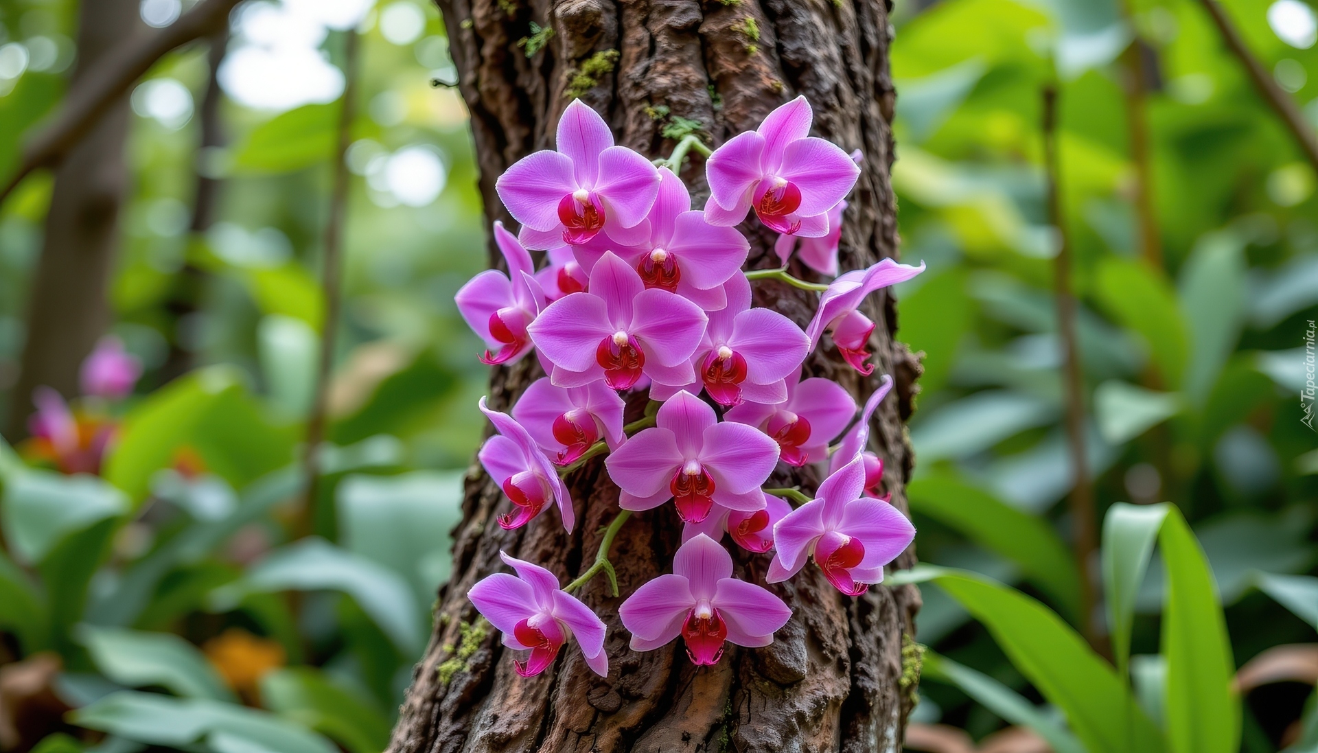 Edytor tapety: Fioletowe storczyki rosnące na drzewie