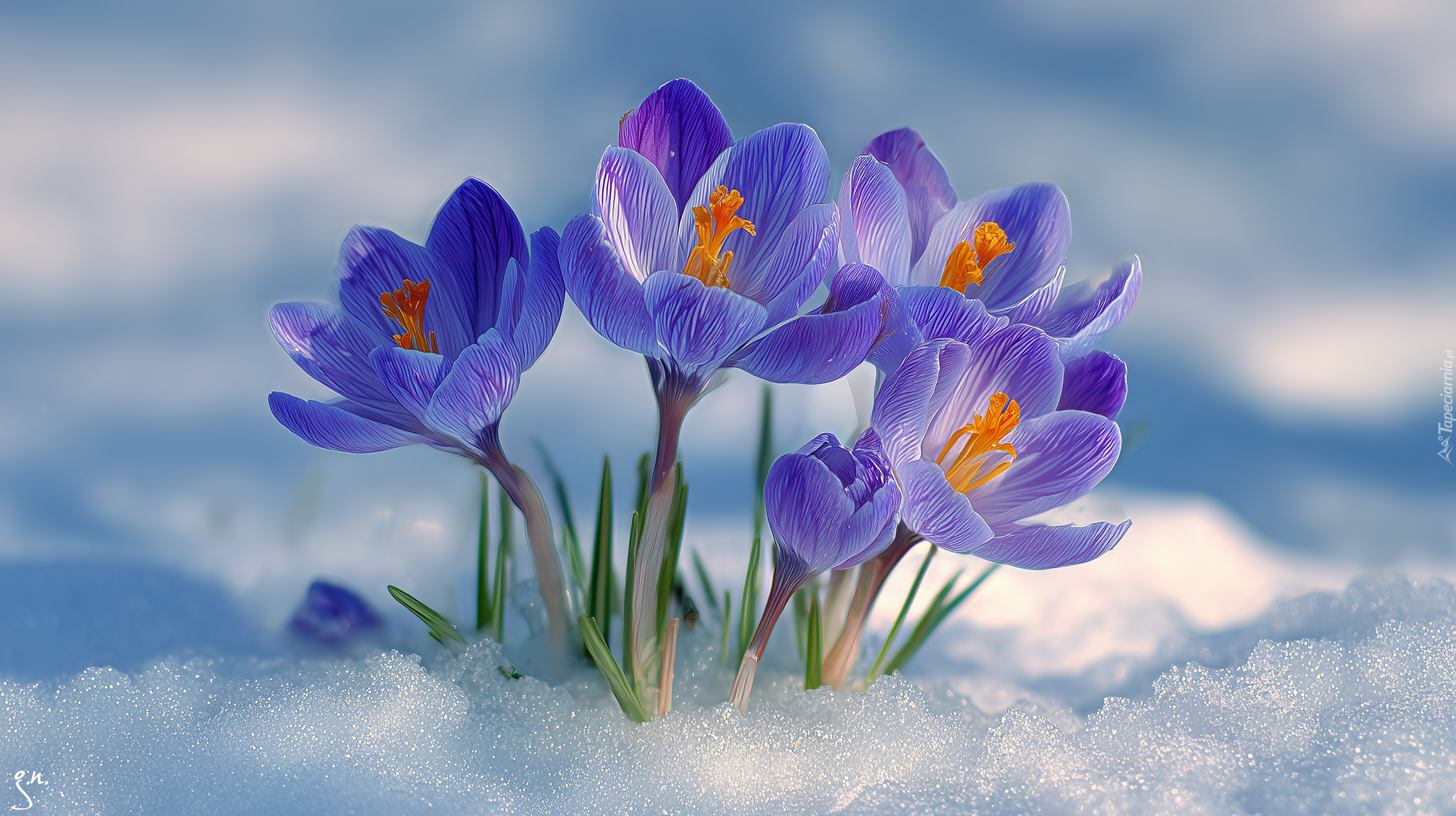Edytor tapety: Kępka fioletowych rozkwitniętych krokusów w śniegu