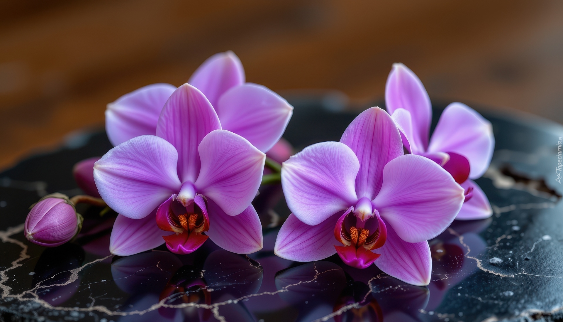 Edytor tapety: Fioletowe storczyki z pąkiem leżące na marmurowym tle