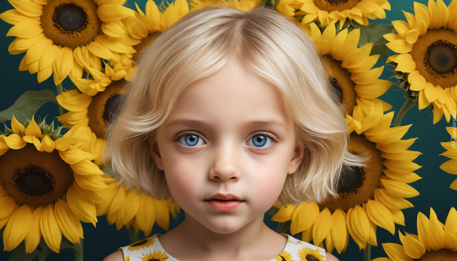 Edytor tapety: Niebieskooka dziewczynka z blond włosami na tle słoneczników