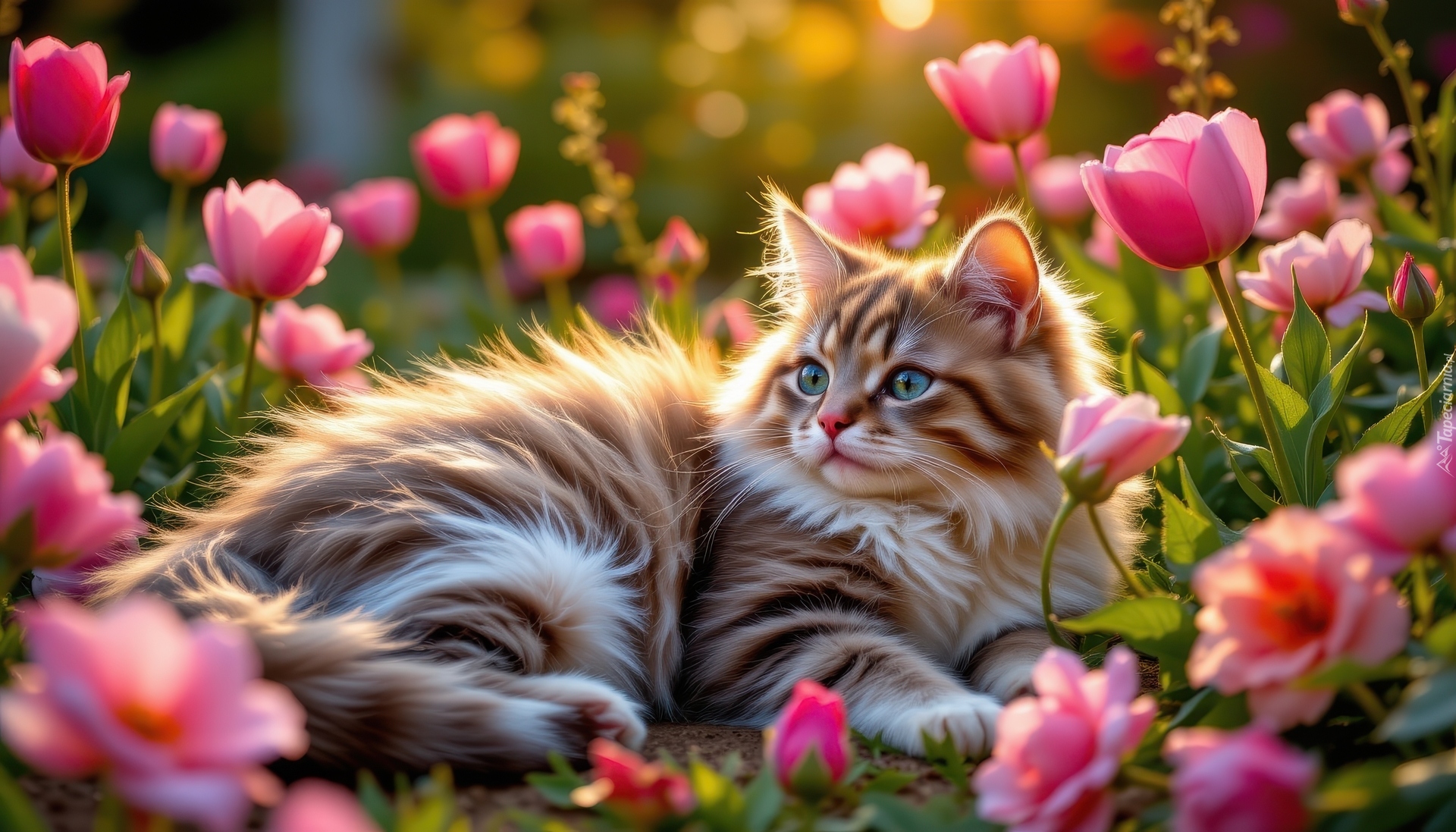 Edytor tapety: Leżący puszysty kot wśród różowych tulipanów