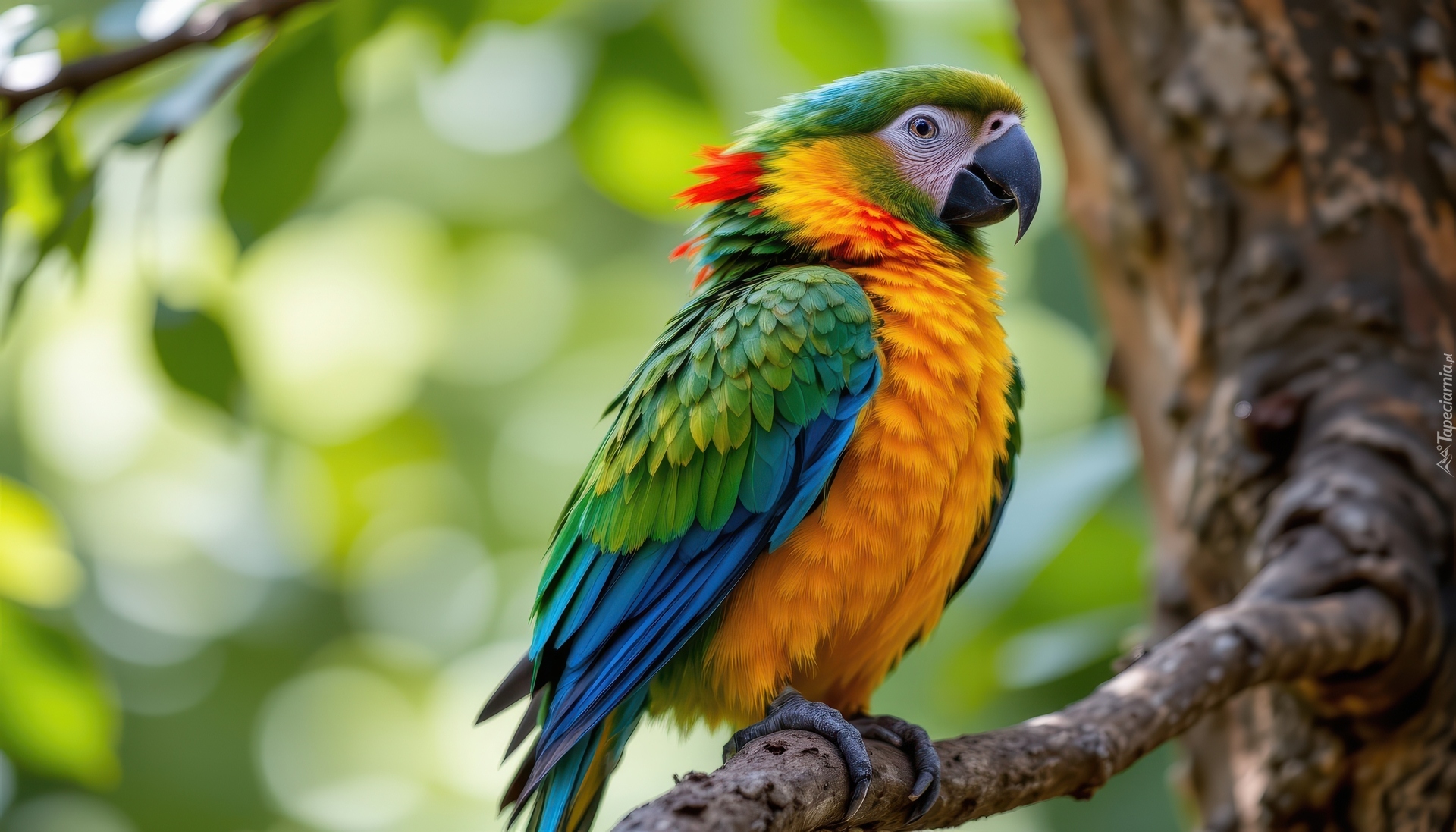 Edytor tapety: Kolorowa papuga na gałęzi drzewa