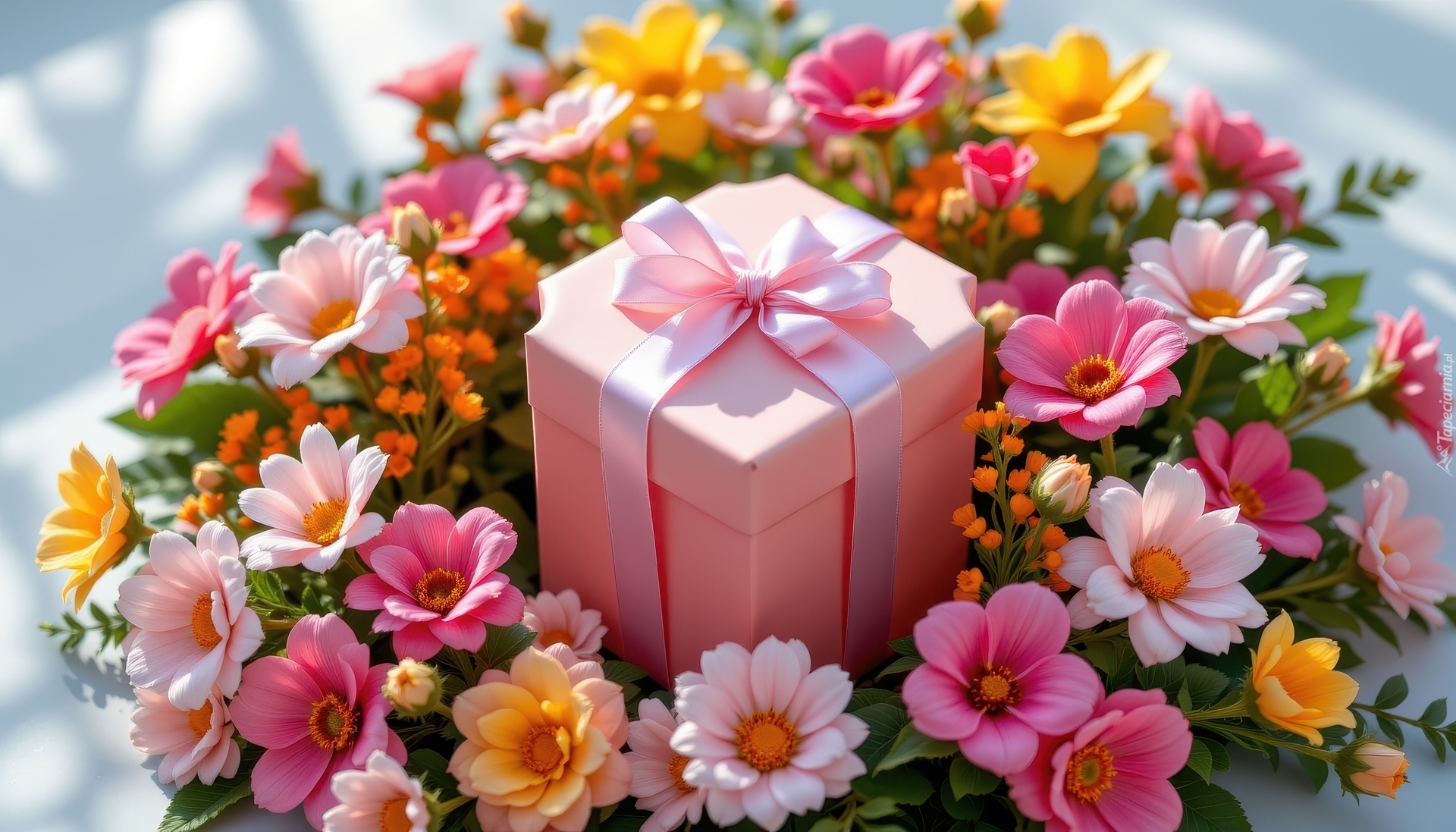 Edytor tapety: Prezent z różową kokardą otoczony kwiatami