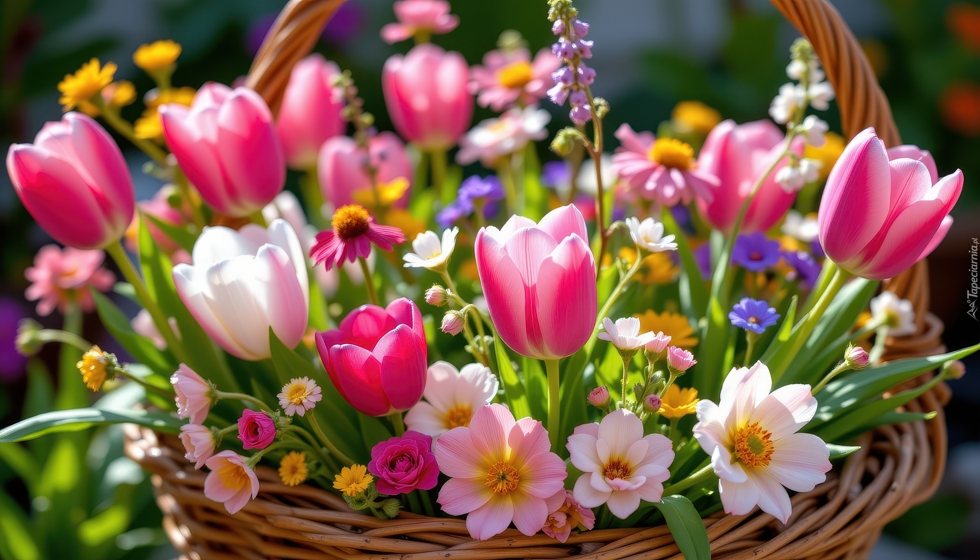 Edytor tapety: Wiklinowy koszyk z tulipanami i drobnymi kwiatami