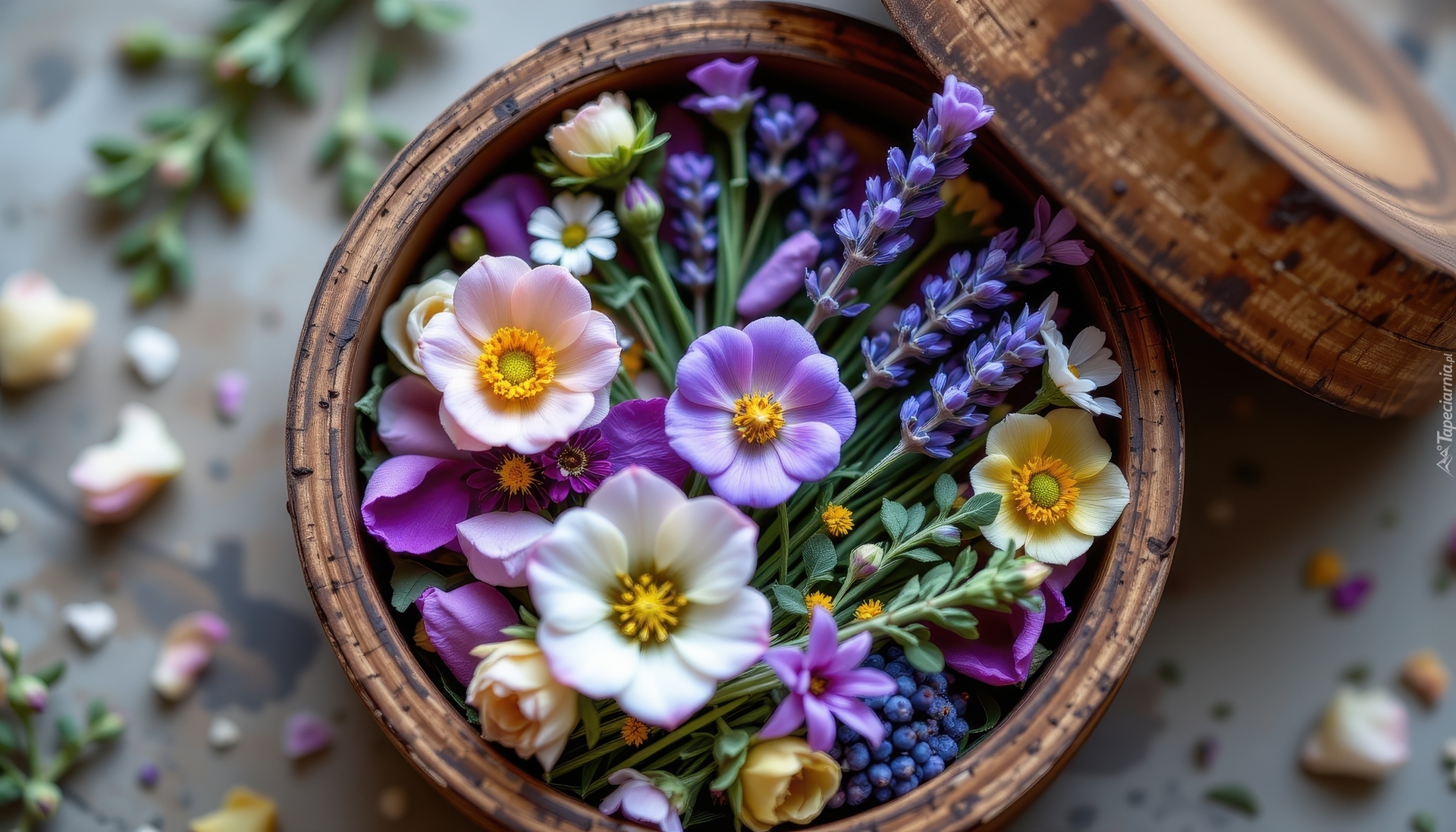 Edytor tapety: Kwiaty i lawenda w okrągłym drewnianym pudełku
