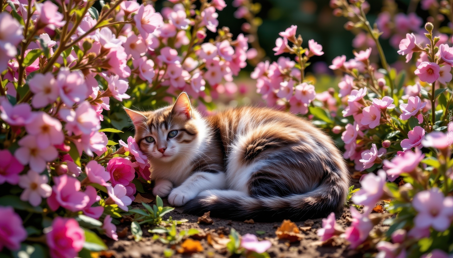Edytor tapety: Leżący kot wśród różowych kwiatów