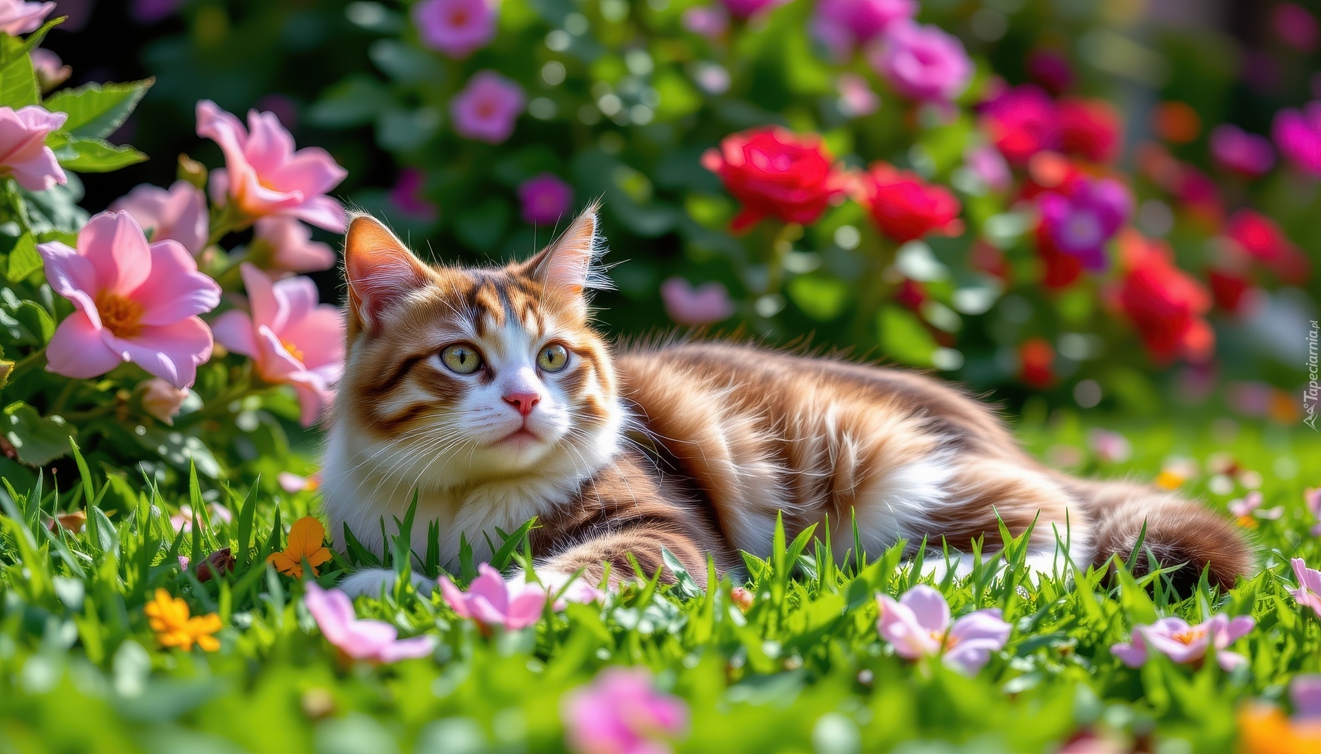 Edytor tapety: Rudo-biały kot leżący na trawie obok kwiatów