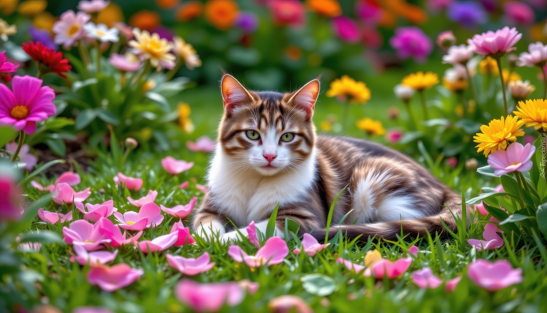 Edytor tapety: Leżący kot na płatkach i trawie obok kwiatów