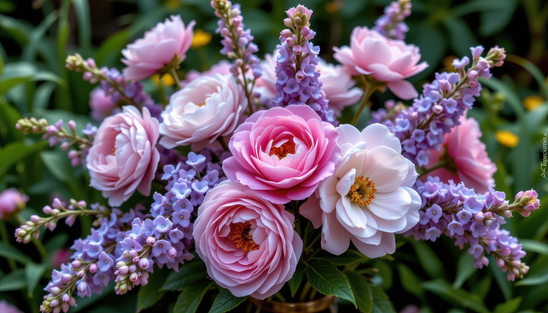 Edytor tapety: Piwonie i gałązki bzu w bukiecie