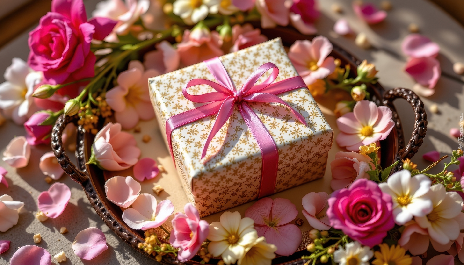 Edytor tapety: Prezent z kokardą na tacy wśród kwiatów