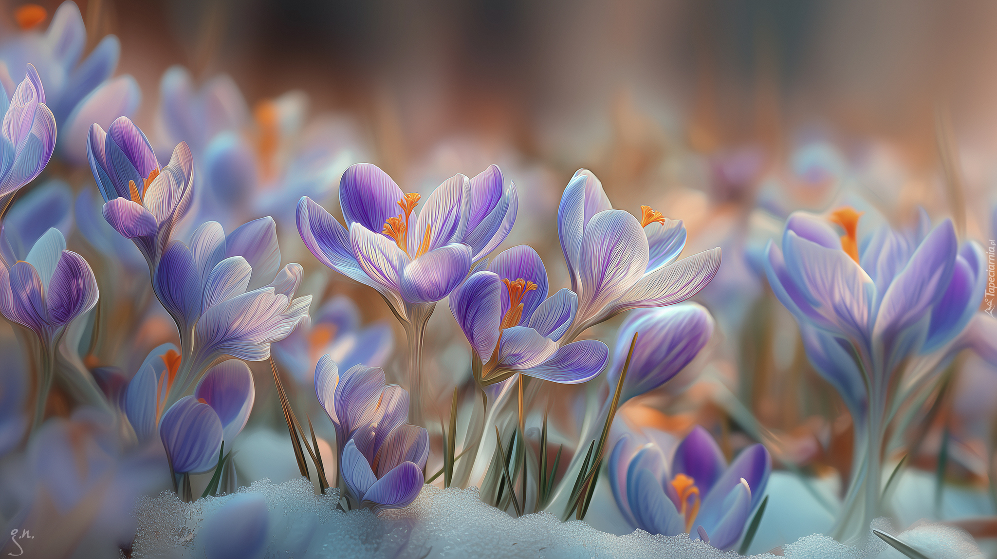 Edytor tapety: Fioletowo-białe krokusy w śniegu