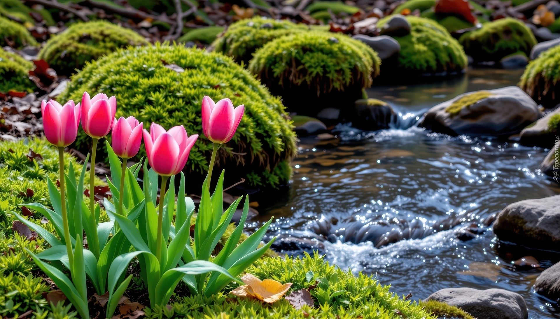 Edytor tapety: Różowo-białe tulipany i omszałe kamienie nad strumieniem