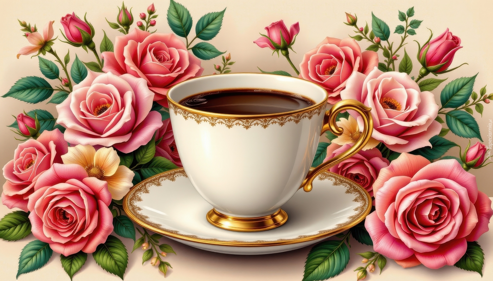 Edytor tapety: Grafika z różami obok filiżanki z kawą