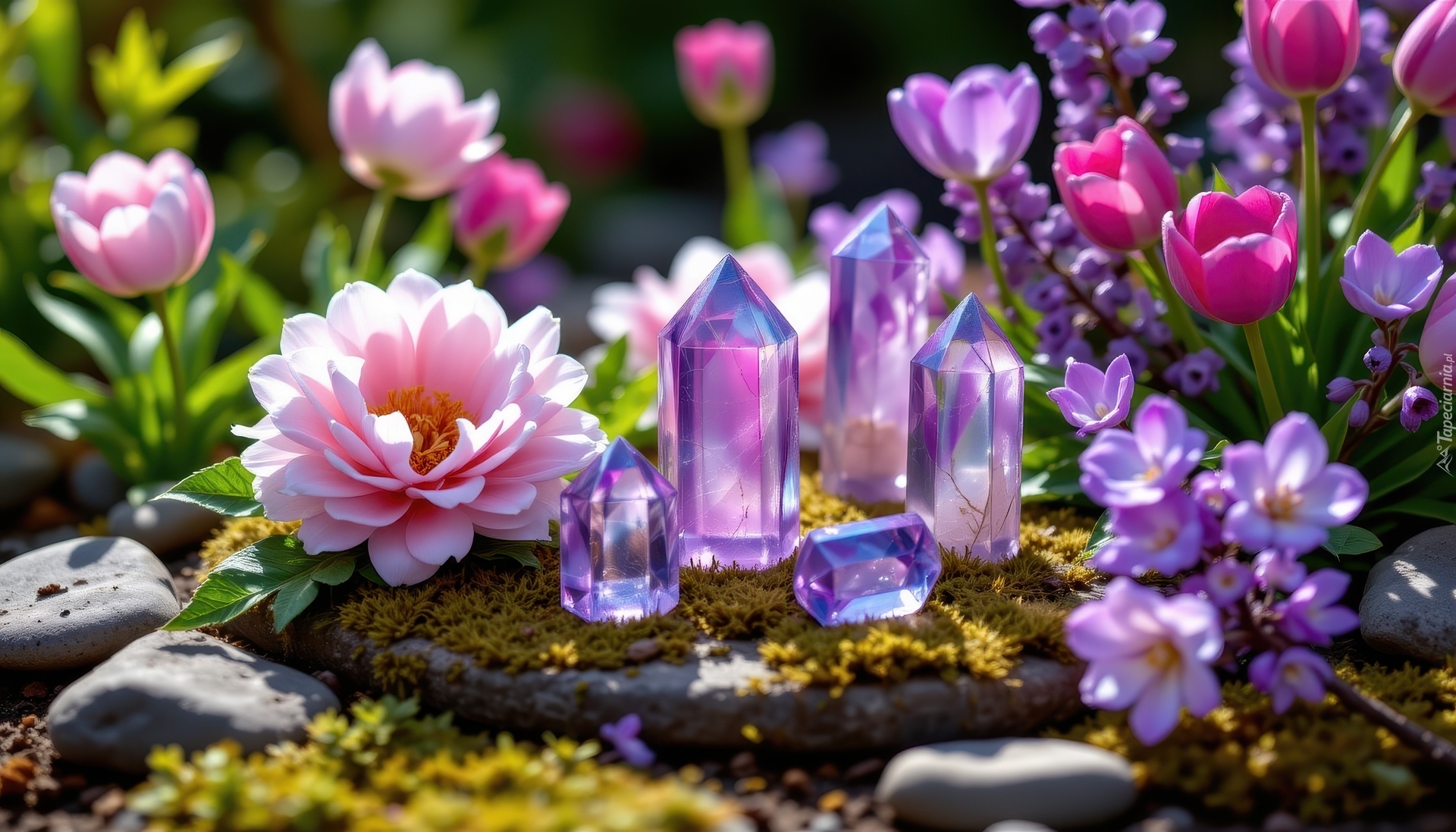 Edytor tapety: Kryształy obok tulipanów i piwonii na omszałym kamieniu