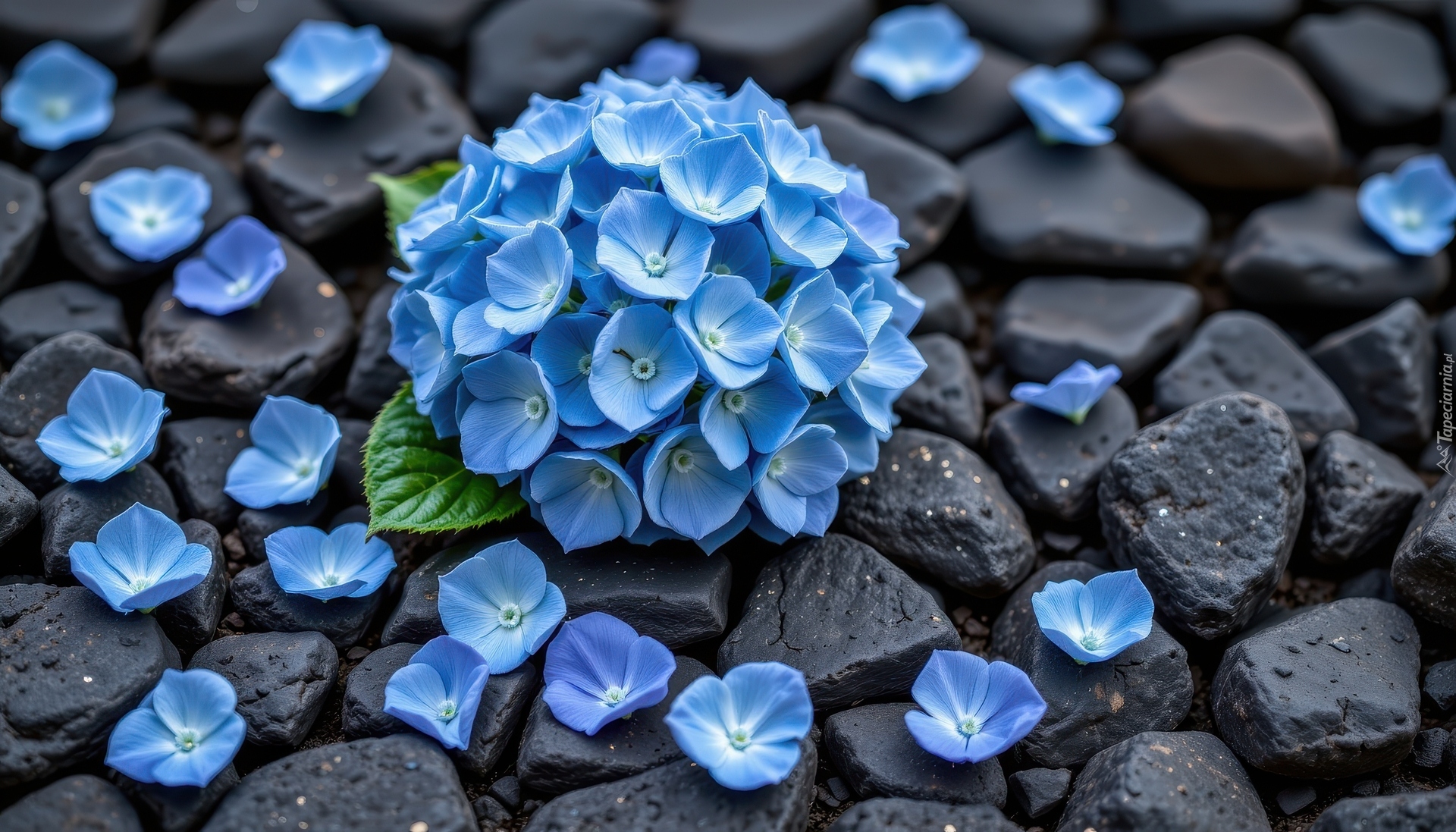 Edytor tapety: Płatki leżące obok niebieskiej hortensji na czarnych kamieniach