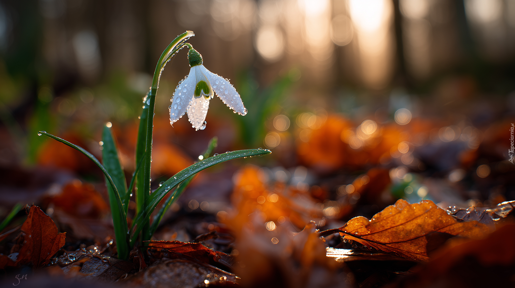 Edytor tapety: Rozświetlony mokry przebiśnieg obok brązowych liści