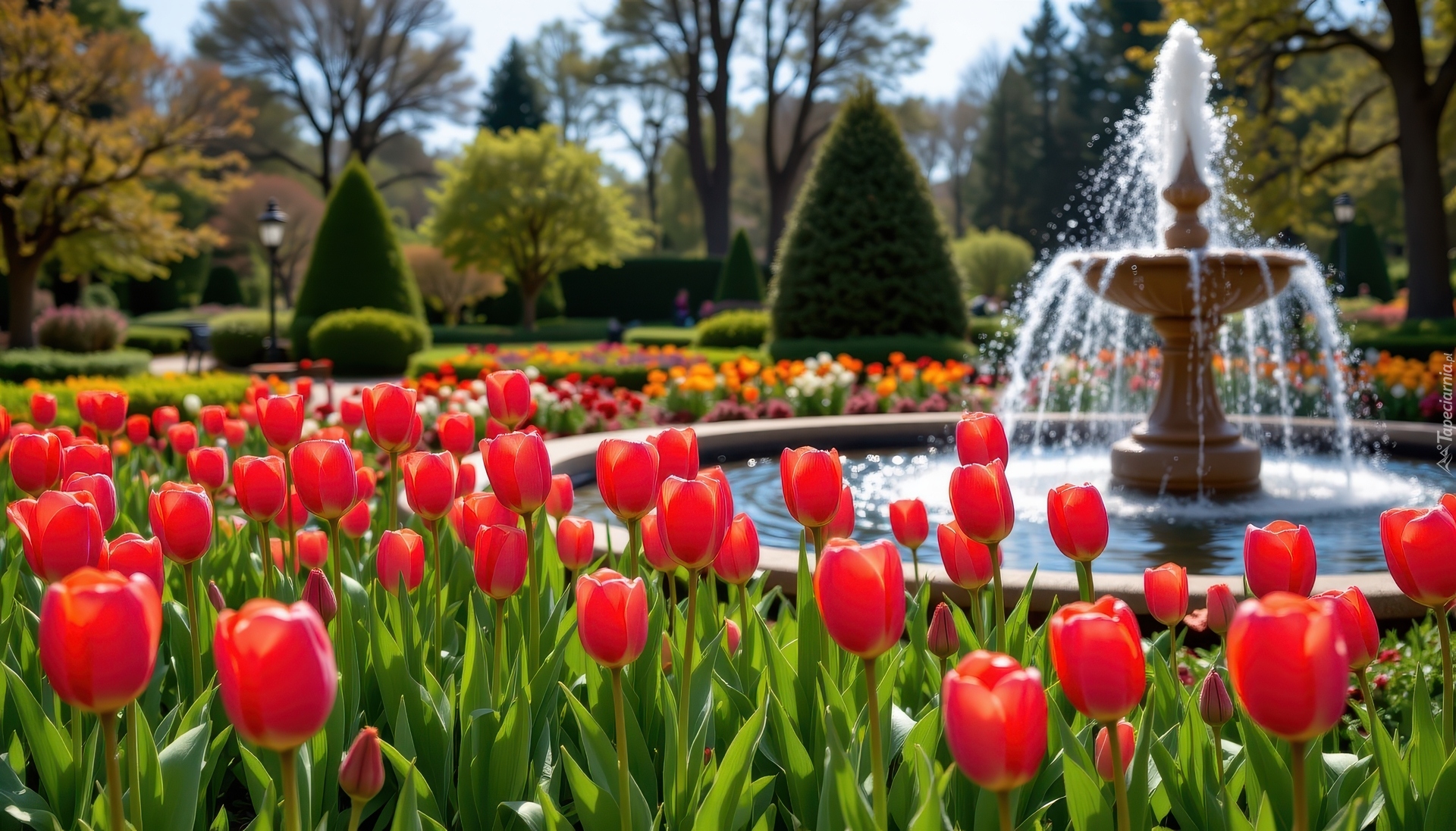 Edytor tapety: Czerwone tulipany wokół fontanny w parku