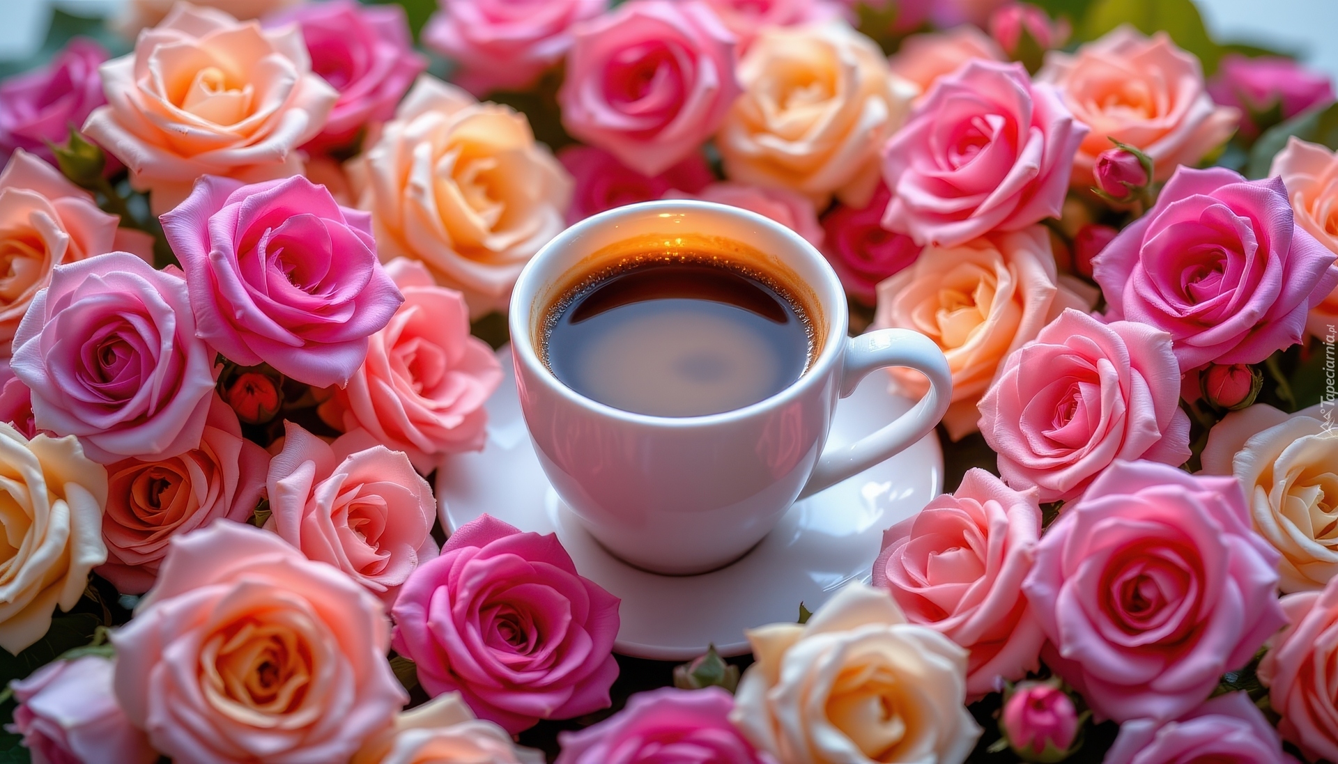 Edytor tapety: Biała filiżanka z kawą wśród kwiatów róży
