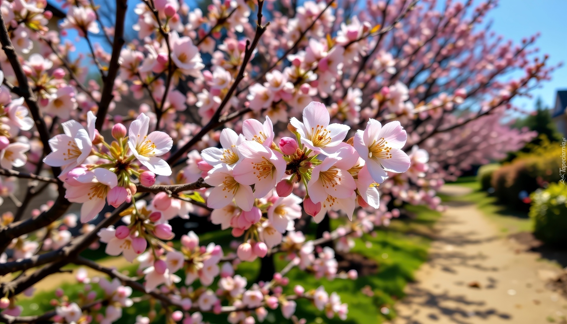 Edytor tapety: Kwitnące drzewa owocowe przy ścieżce