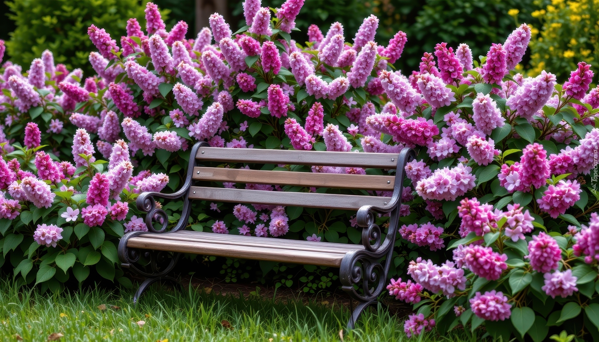 Edytor tapety: Ławka na trawie obok krzewu z różowymi kwiatami