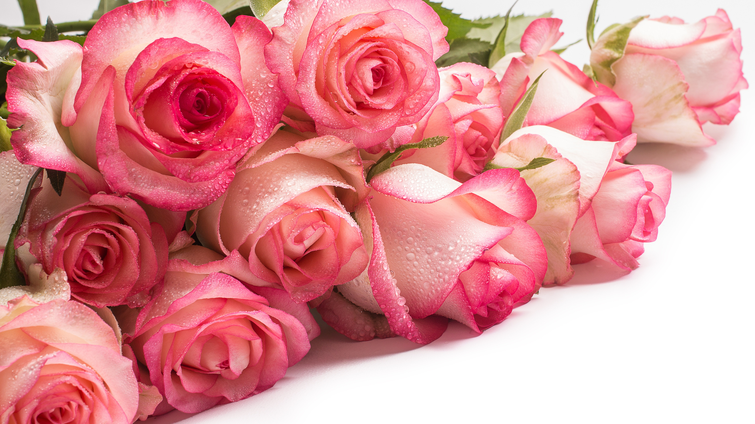 Edytor tapety: Bukiet mokrych jasnoróżowych róż na białym tle