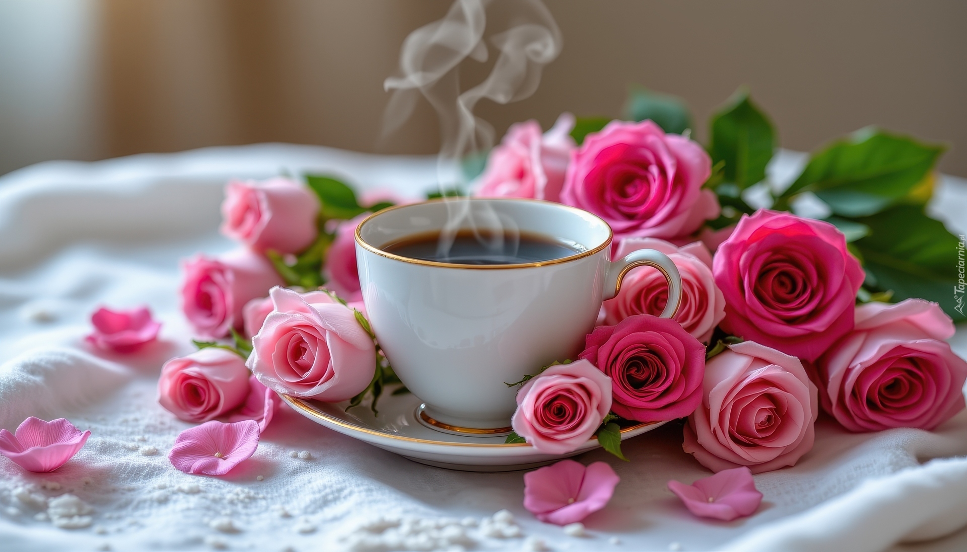 Edytor tapety: Filiżanka z kawą obok różowych róż na serwecie