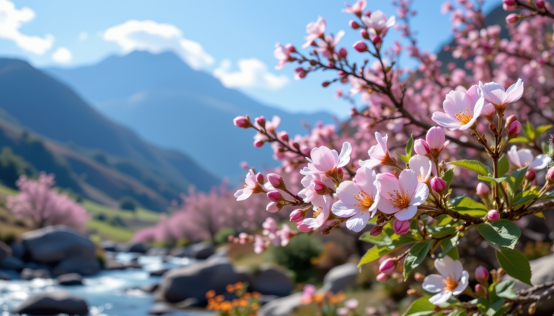 Edytor tapety: Gałązki z różowymi kwiatami na tle gór