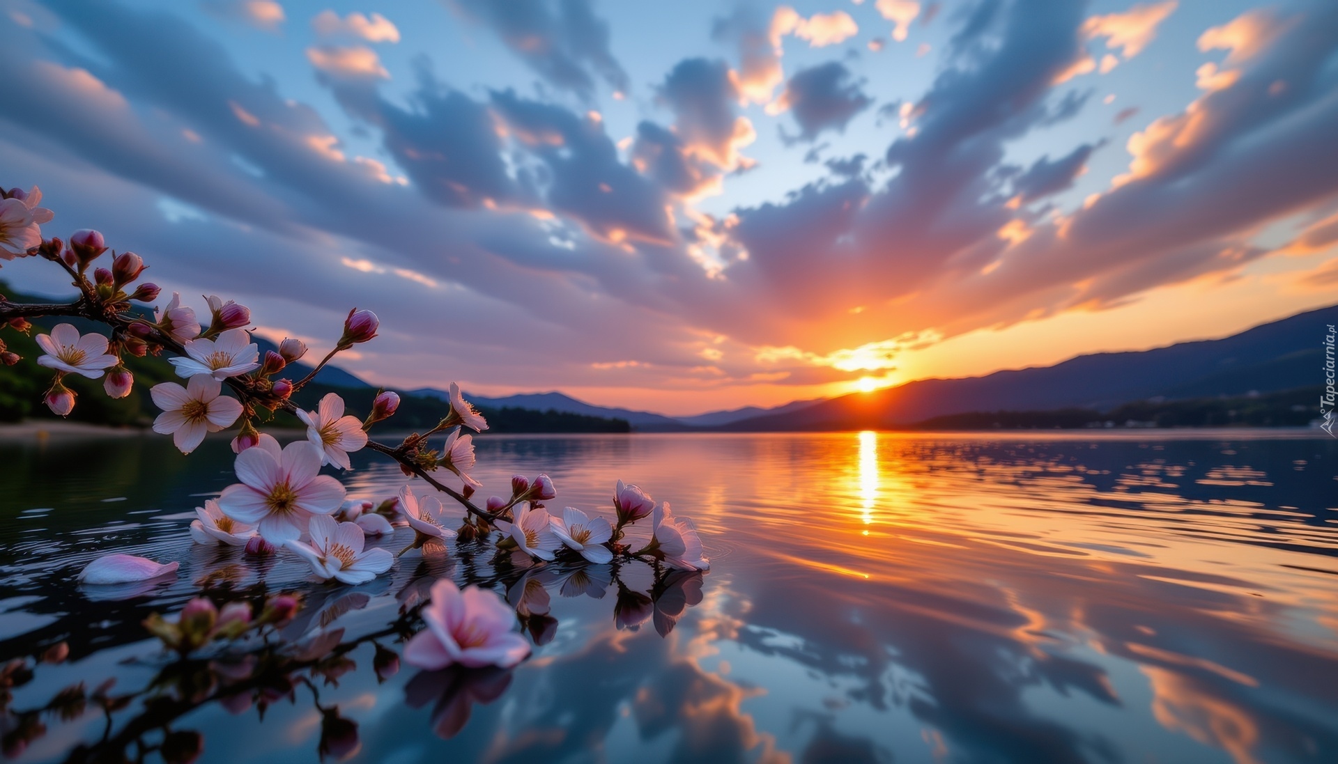 Edytor tapety: Kwitnąca gałązka na wodzie jeziora o zachodzie słońca