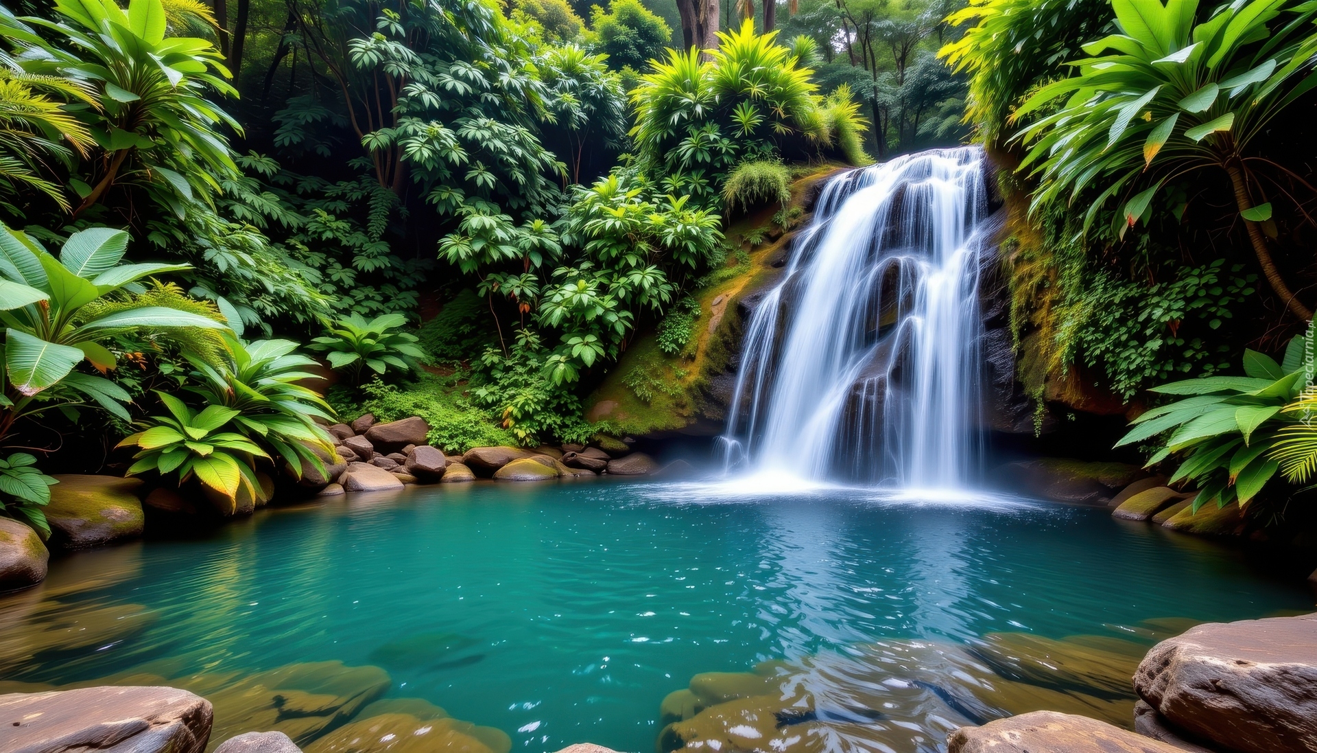 Edytor tapety: Egzotyczne rośliny i kamienie przy wodospadzie na skałach