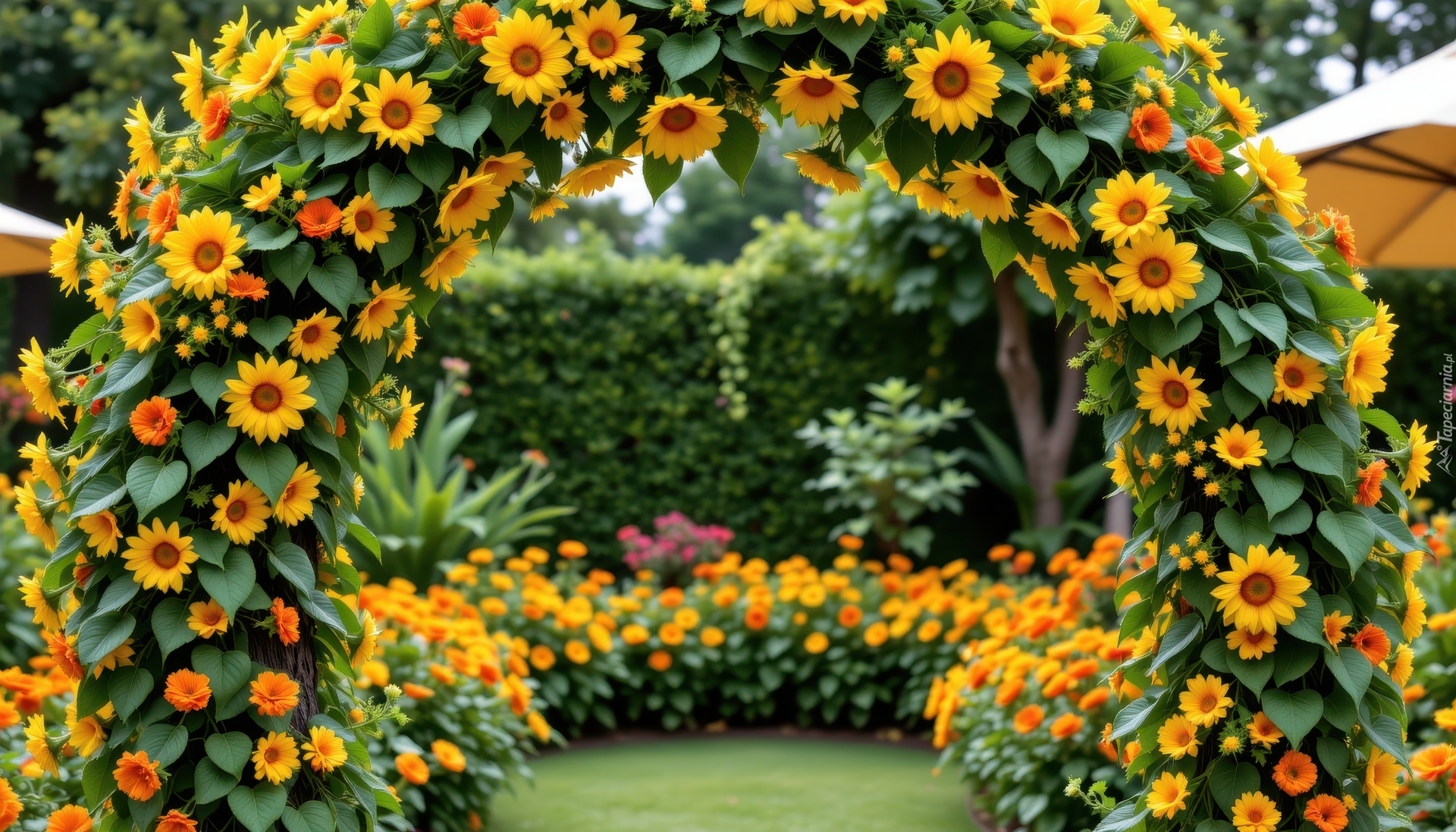 Edytor tapety: Łuk z żółtych kwiatów i liści w ogrodzie