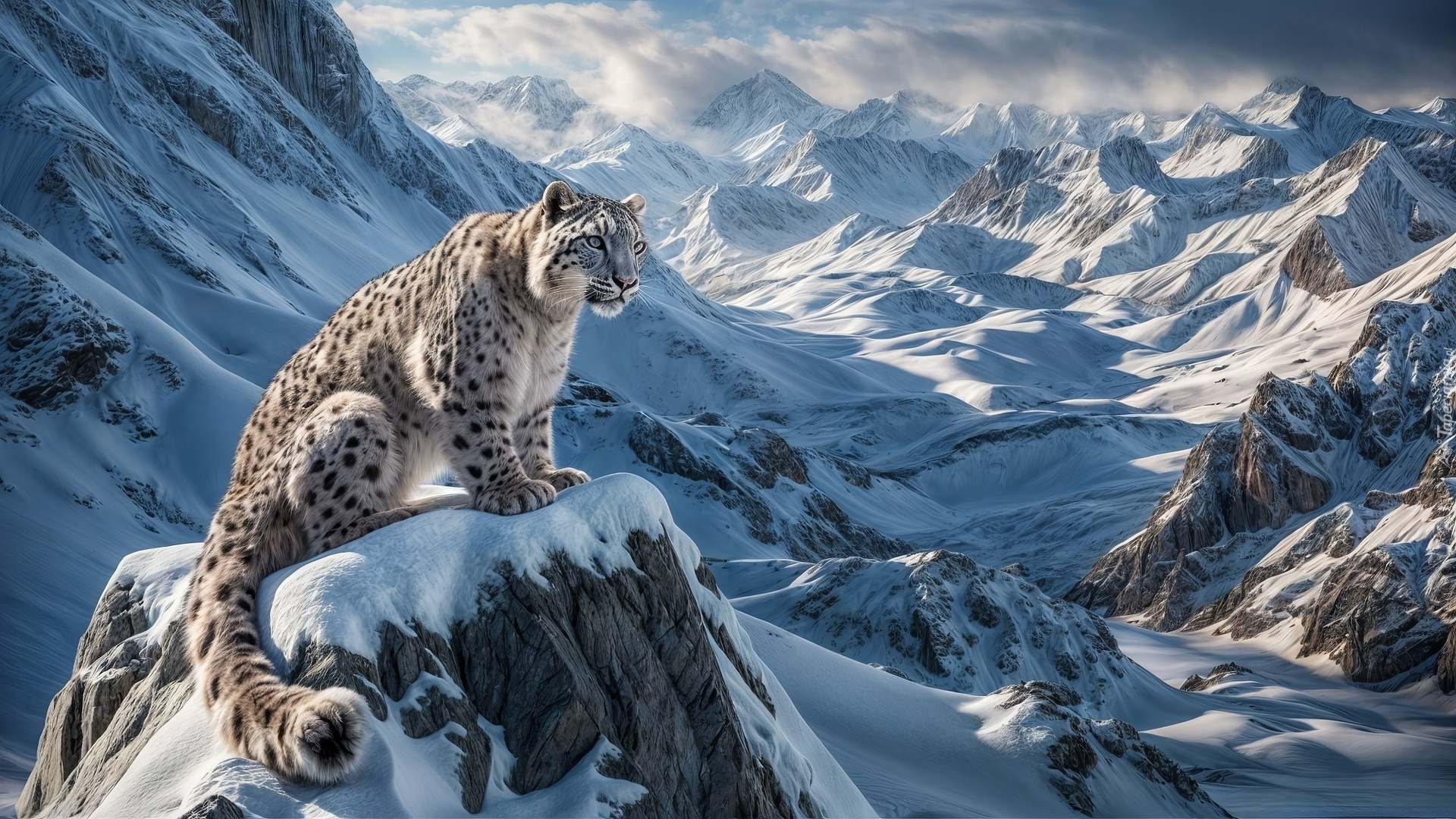 Edytor tapety: Irbis siedzący na skale na tle ośnieżonych gór