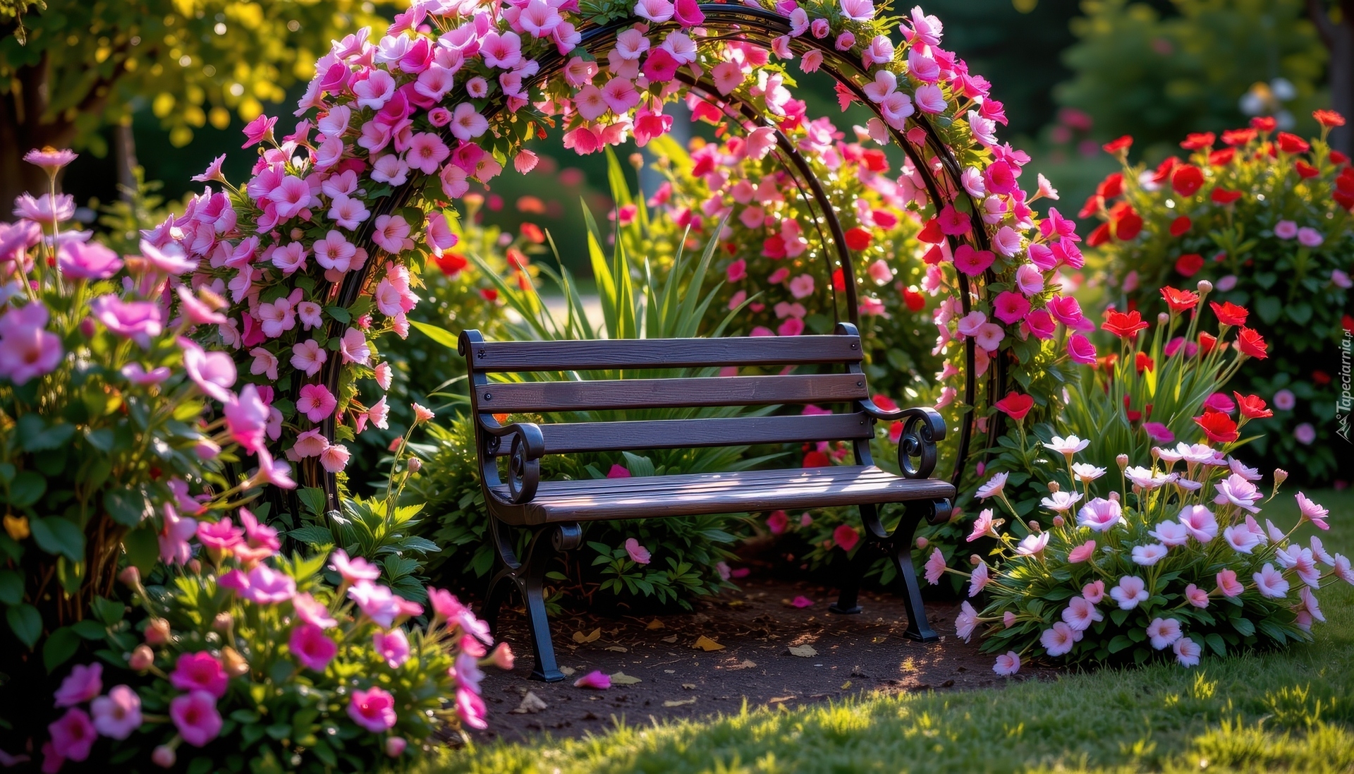 Edytor tapety: Ławka pod kwiatowym łukiem w ogrodzie