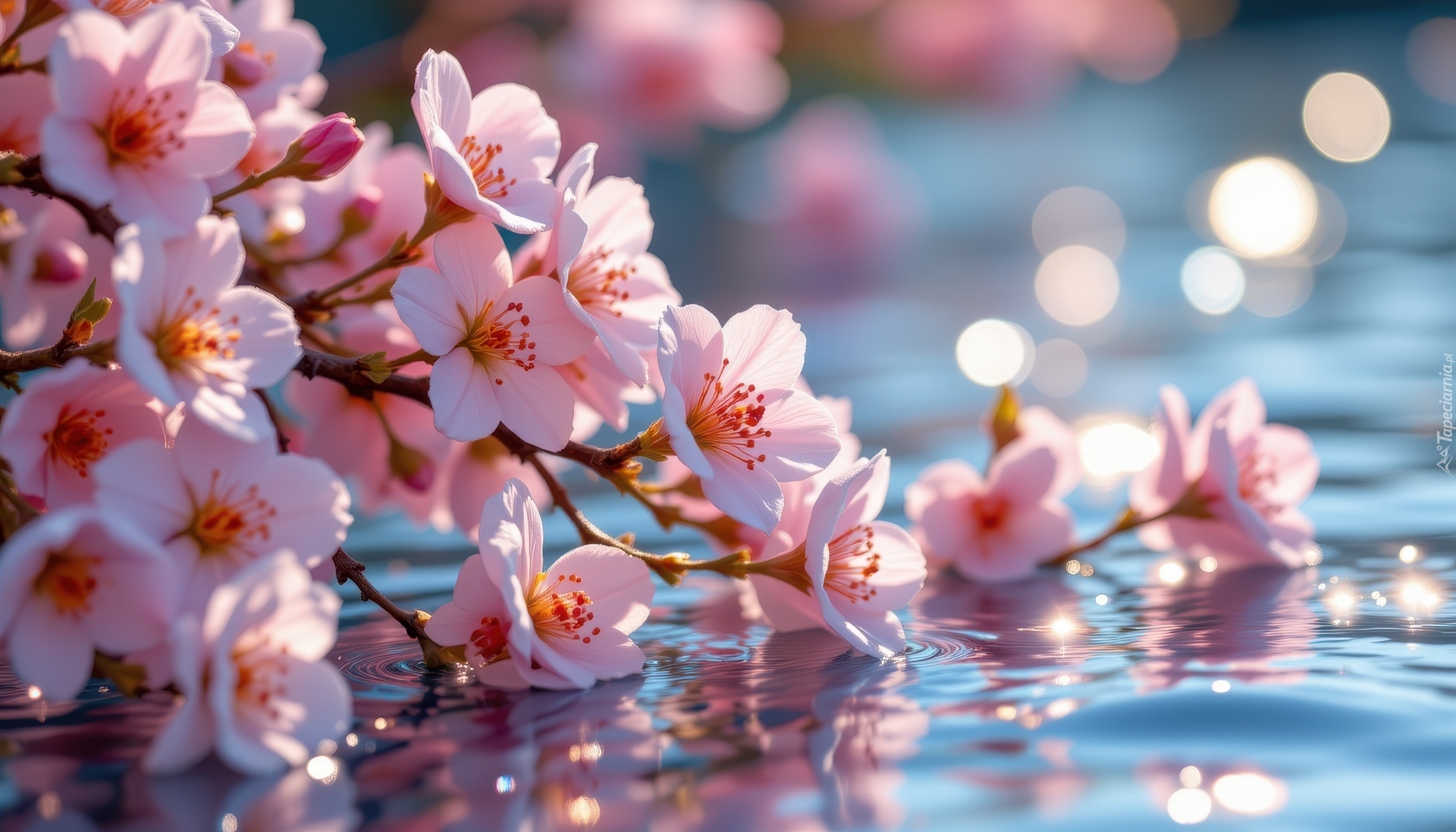 Edytor tapety: Rozświetlona słońcem gałązka z różowymi kwiatami na wodzie