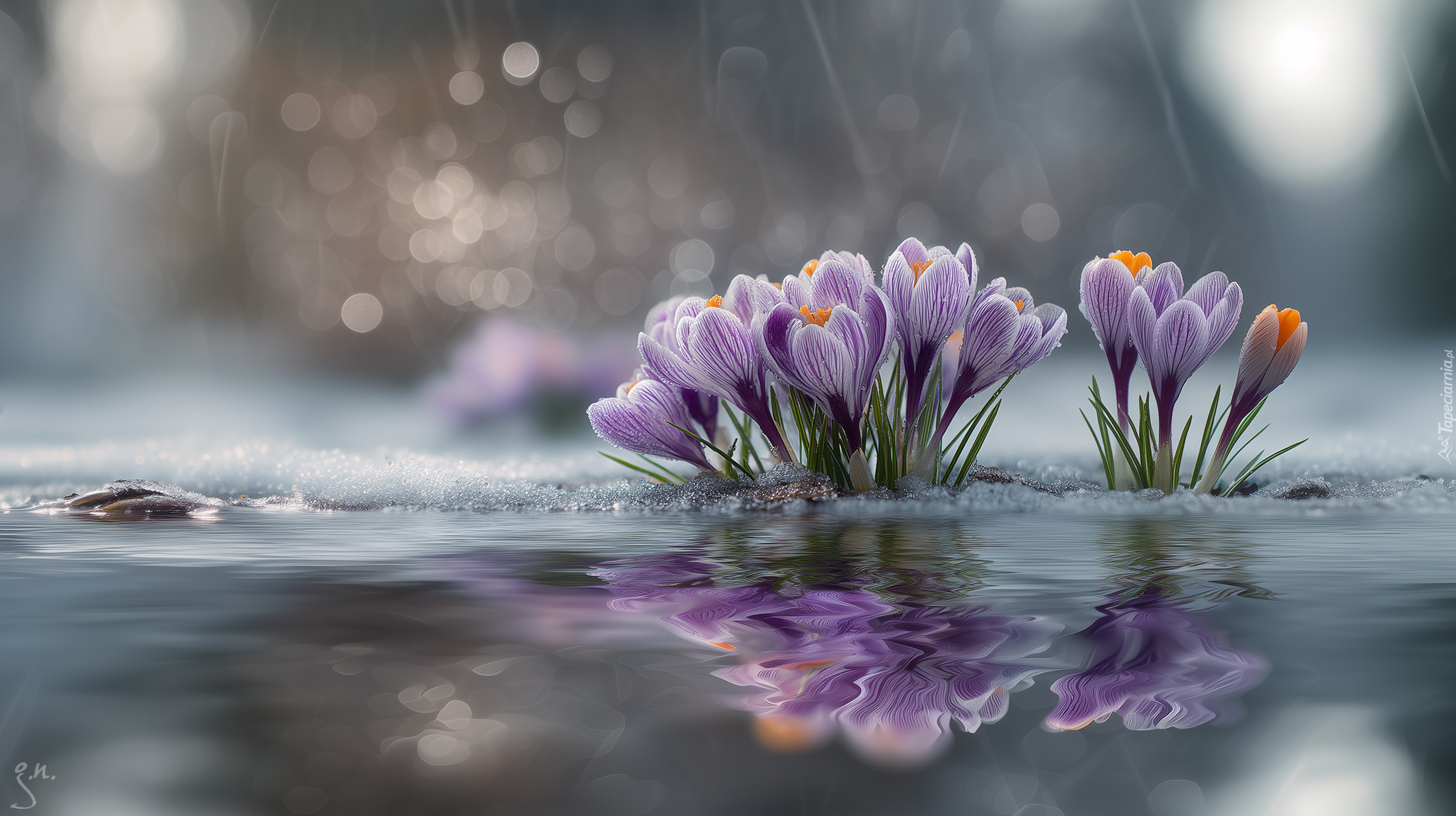 Edytor tapety: Kępki fioletowych krokusów w wodzie