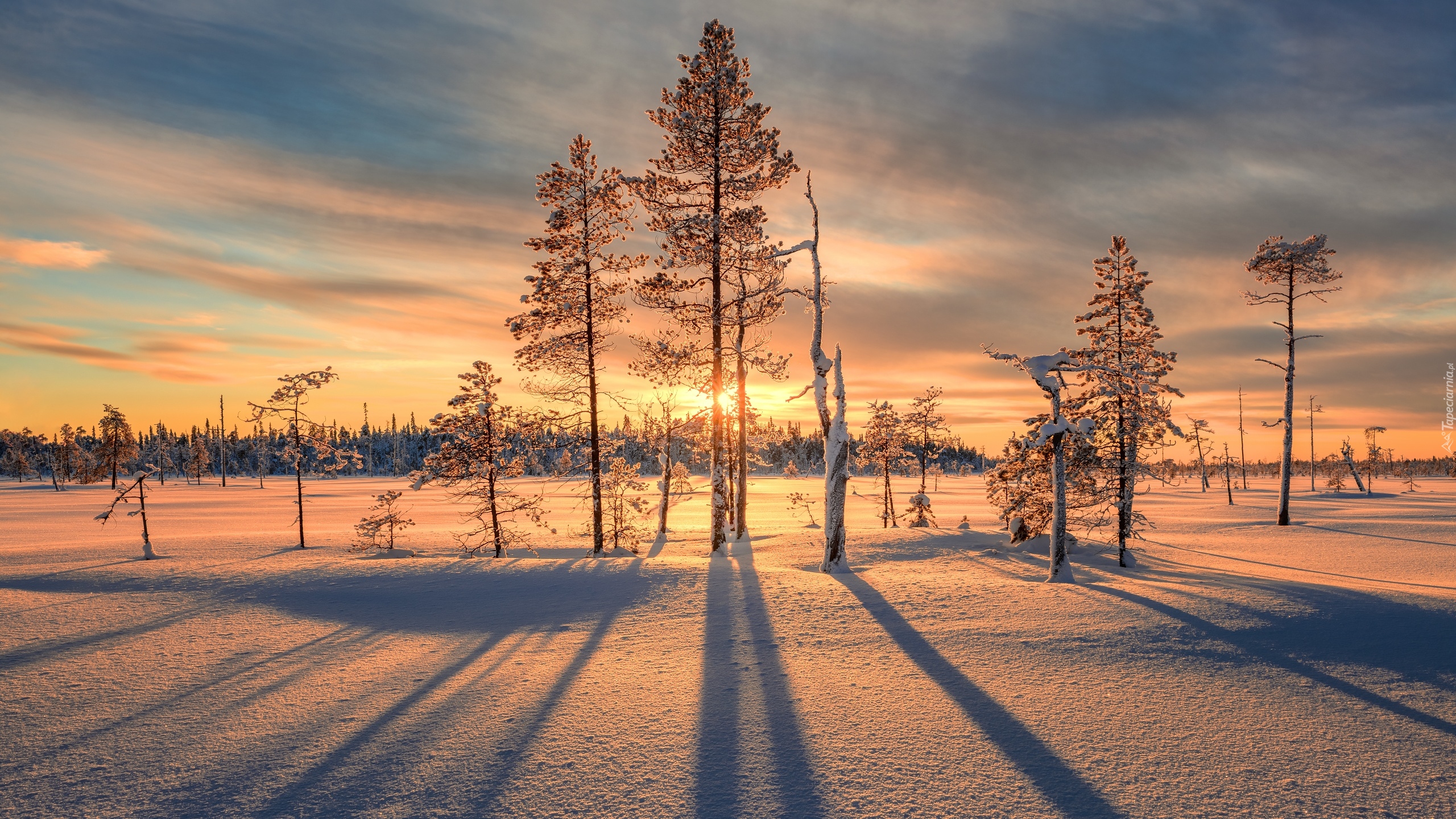 Edytor tapety: Cienie drzew na śniegu o zachodzie słońca