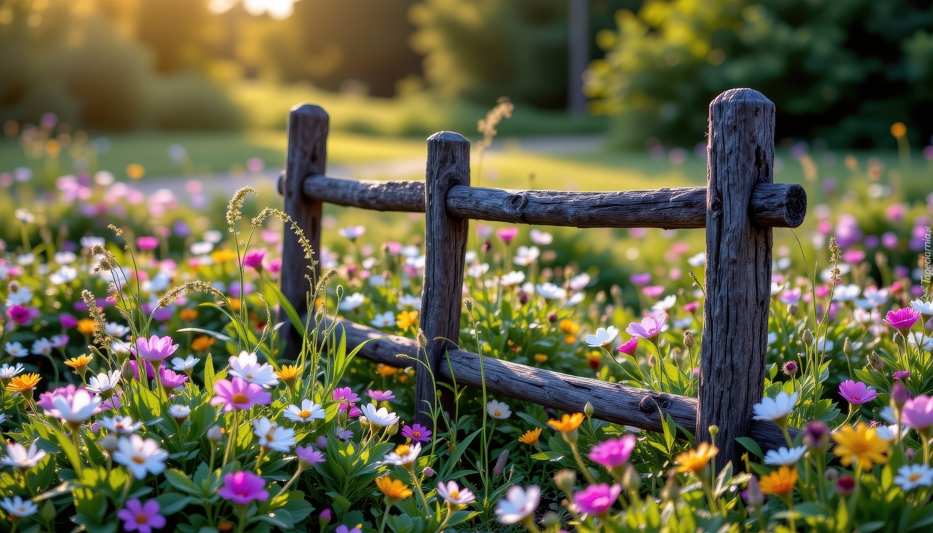 Edytor tapety: Ogrodzenie i kolorowe kwiaty na łące