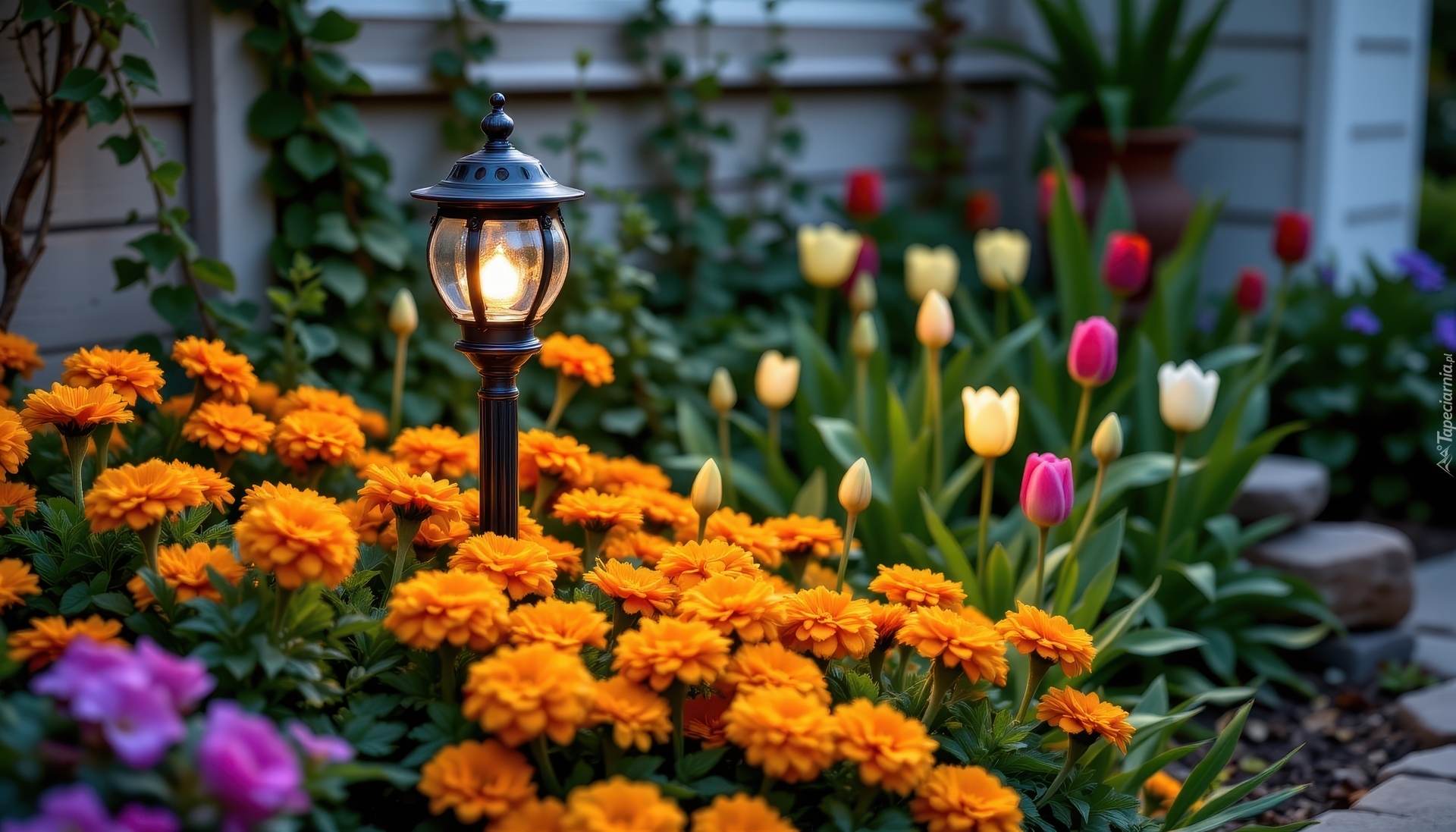 Edytor tapety: Latarnia wśród aksamitek i tulipanów w ogrodzie