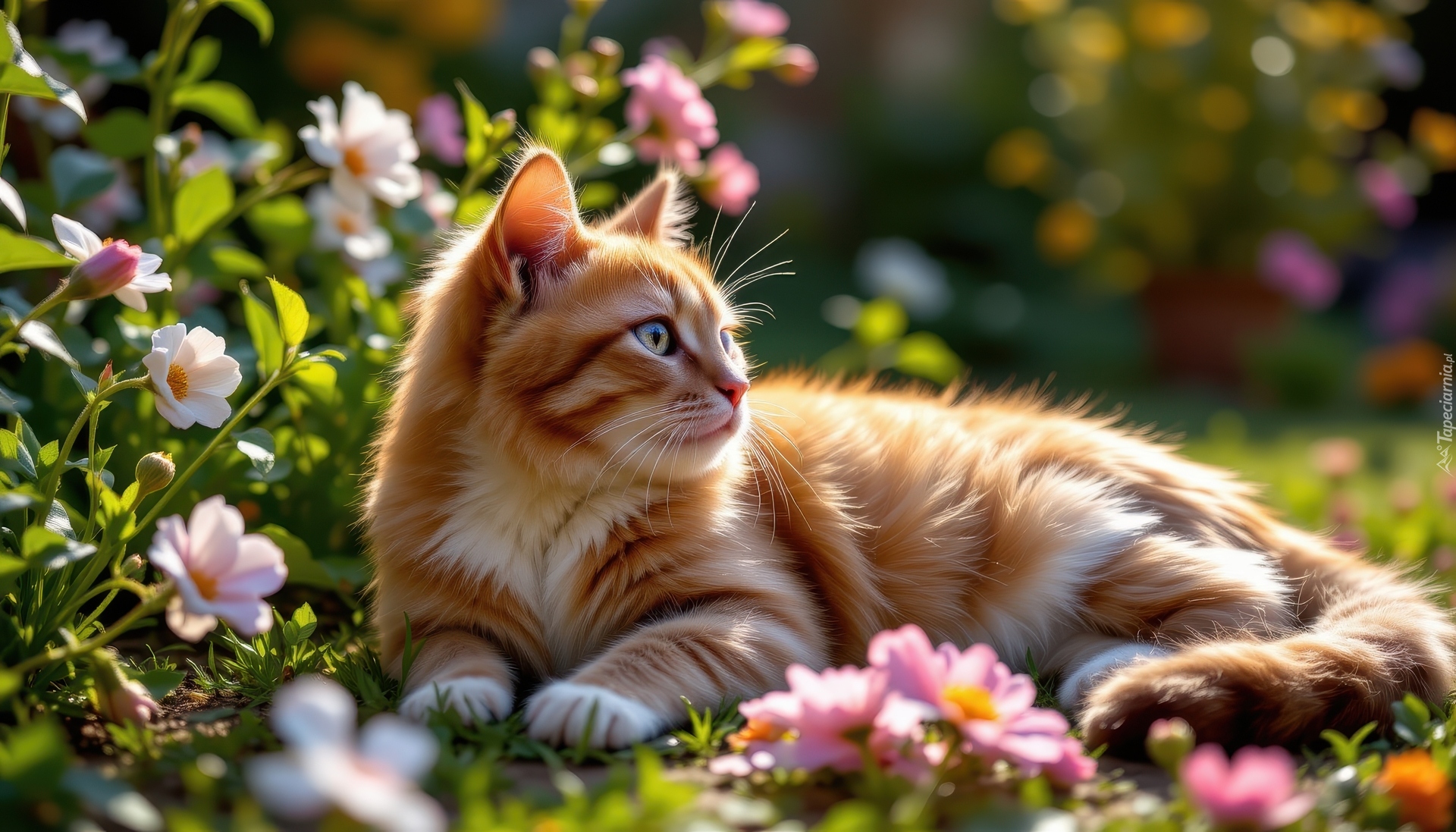 Edytor tapety: Spojrzenie leżącego rudego kota obok kwiatów