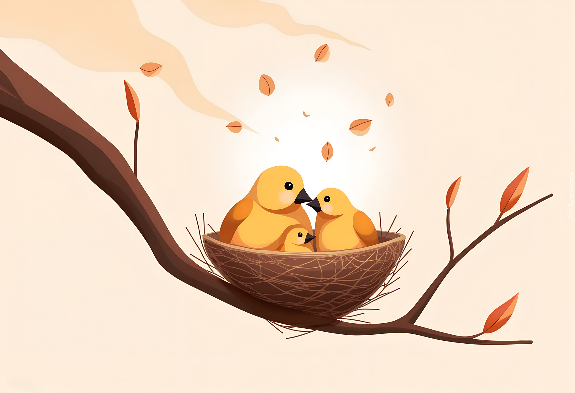 Edytor tapety: Trzy ptaki w gniazdku na gałązce