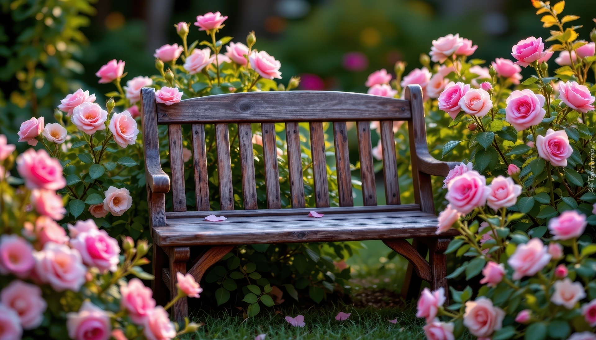 Edytor tapety: Drewniana ławka obok różowych róż