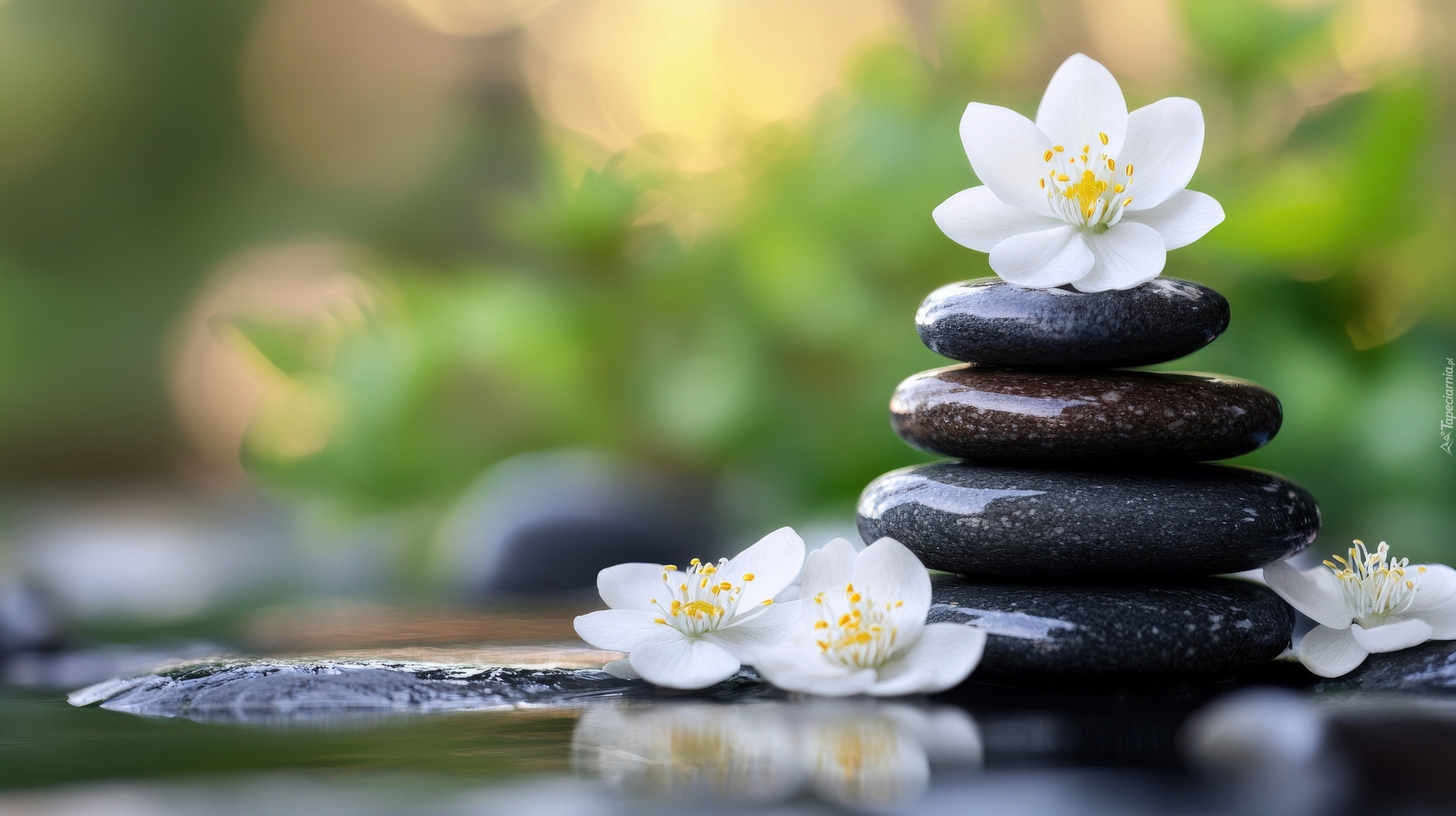 Edytor tapety: Białe kwiaty i ciemne kamienie obok wody