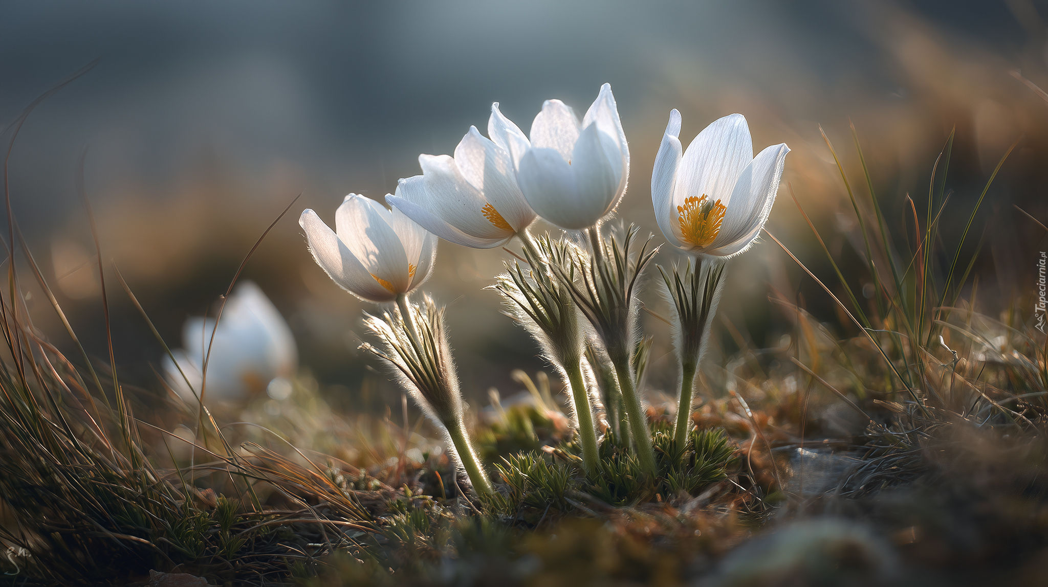 Edytor tapety: Kępka białych sasanek w grafice