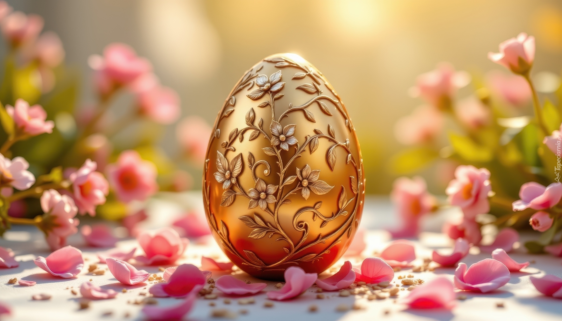 Edytor tapety: Złota pisanka z motywem kwiatowym obok różowych płatków