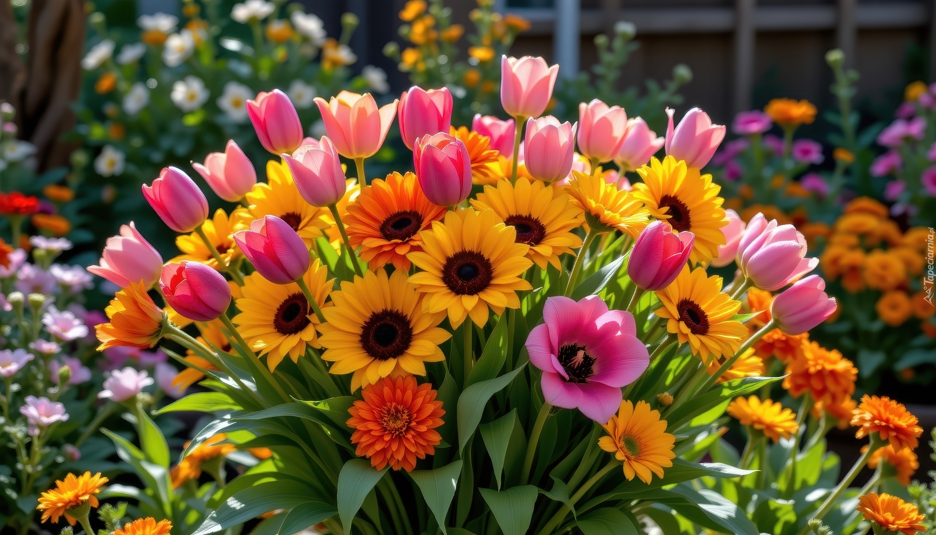 Edytor tapety: Różowe tulipany i słoneczniki w bukiecie