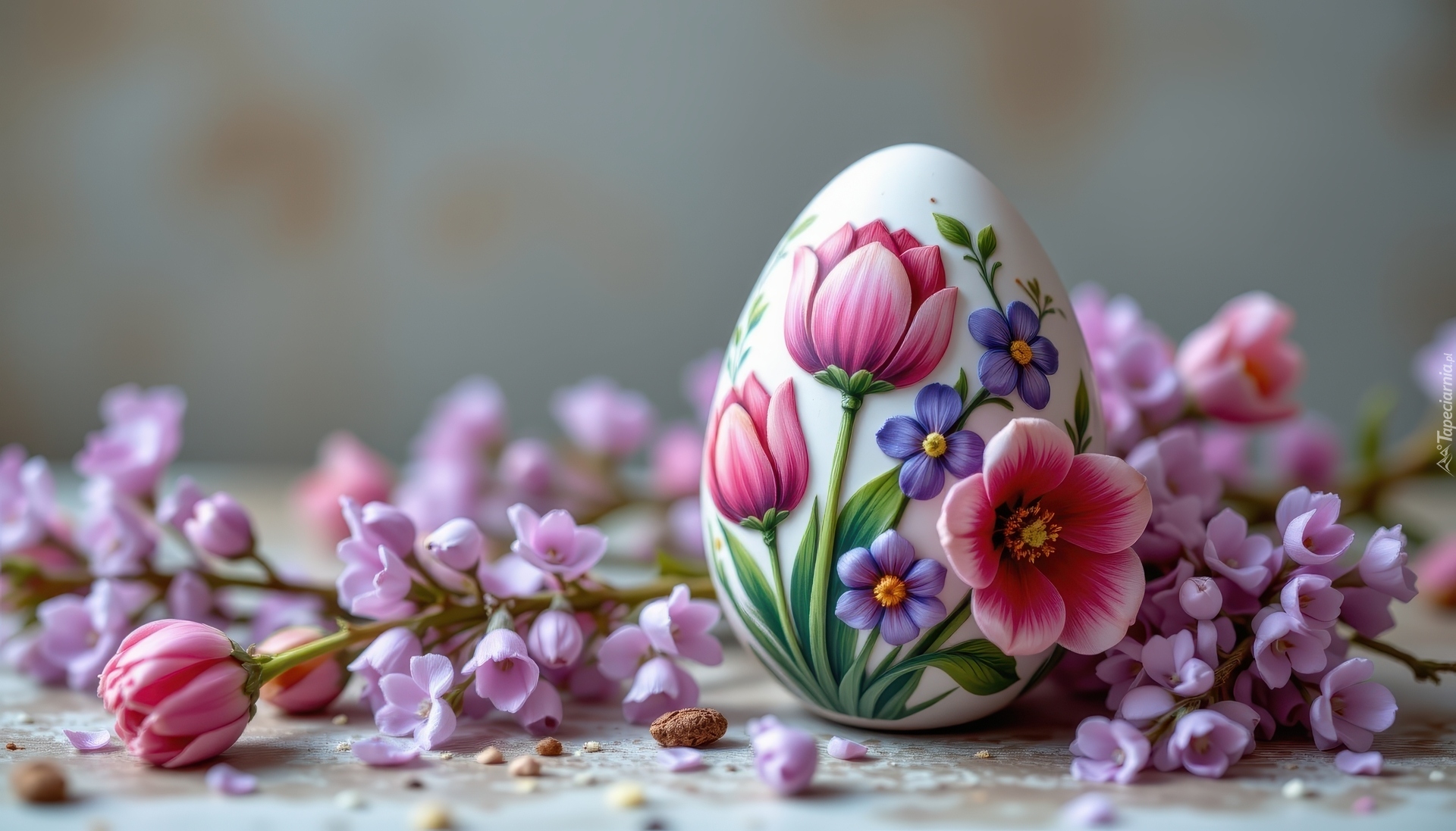 Edytor tapety: Kwiaty przy białym jajku wielkanocnym ozdobionym tulipanami