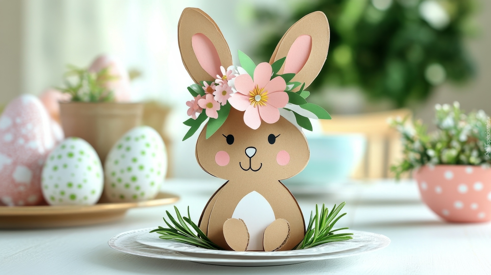 Edytor tapety: Pisanki i papierowy zajączek w wianku na głowie
