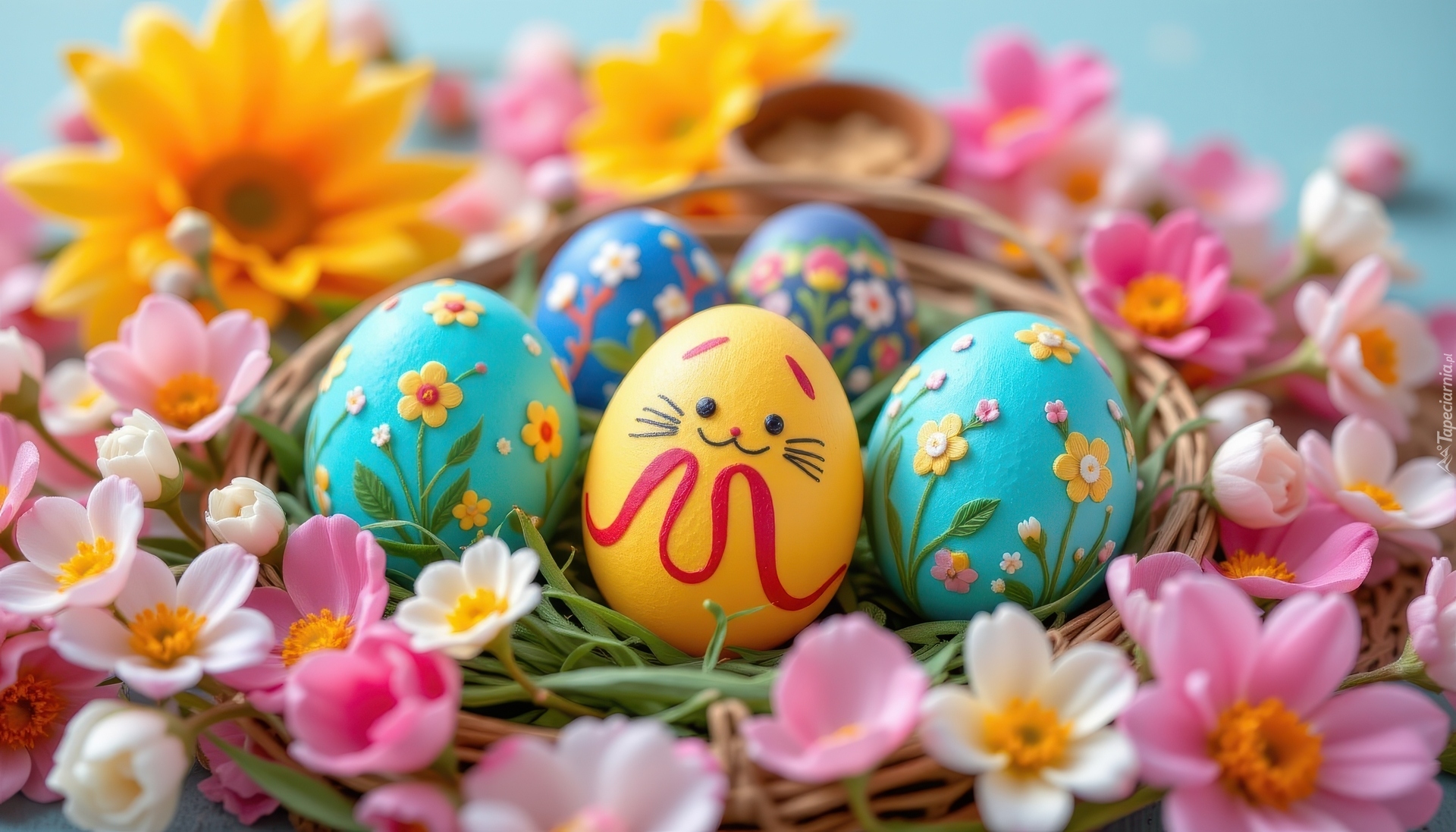 Edytor tapety: Kolorowe pisanki w gniazdku obok kwiatów