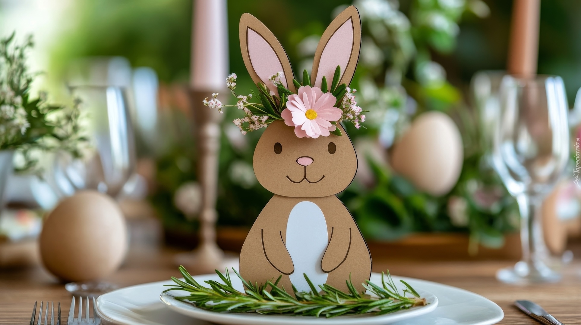 Edytor tapety: Jajka i papierowy zajączek z kwiatem na głowie