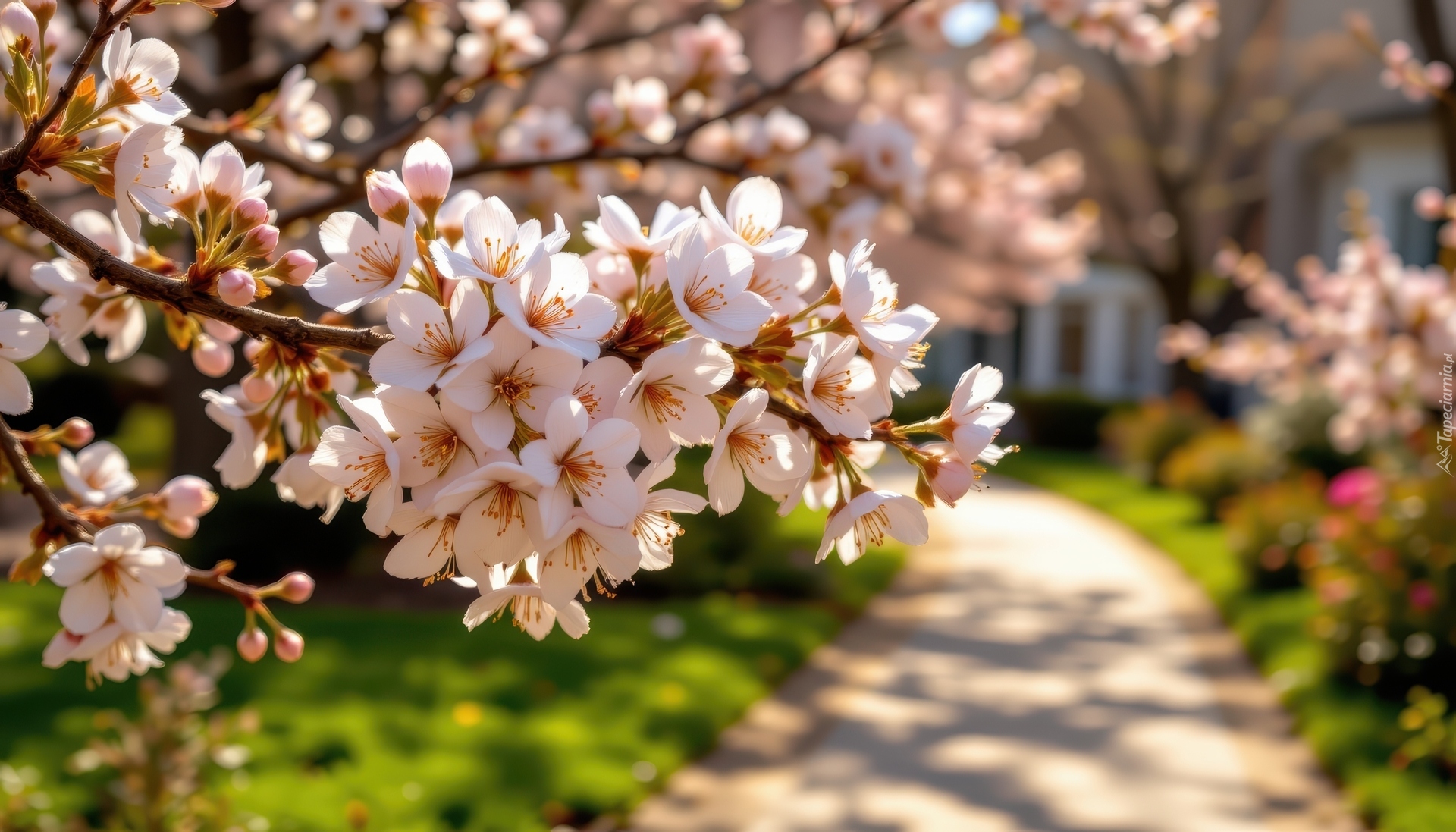 Edytor tapety: Rozświetlona gałązka drzewa owocowego z jasnoróżowymi kwiatami